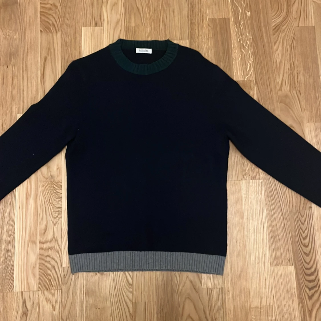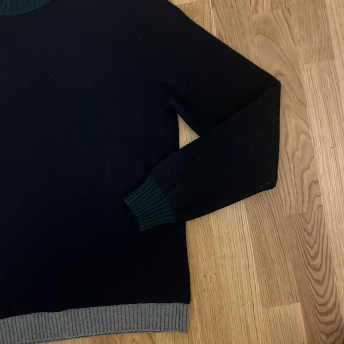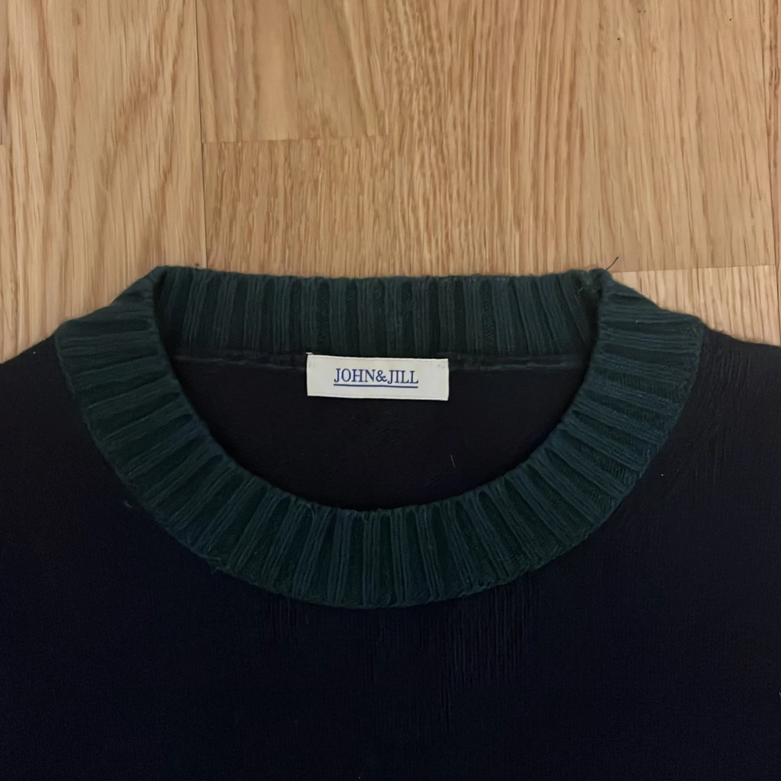 Säljer en stilren mörkblå tröja från John & Jill med ribbade detaljer i grön och grå vid hals, ärmslut och nederkant. Perfekt för en avslappnad och snygg look.