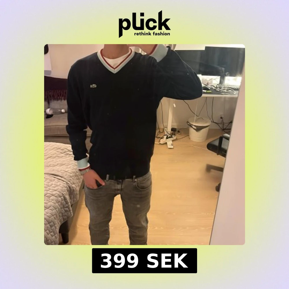Säljer en stilren mörkblå tröja från Lacoste med v-ringad krage i rött och ljusblått. Tröjan har långa ärmar och det klassiska krokodilemblem på bröstet. Perfekt för en avslappnad men snygg look. jag är 182cm och väger ungefär 65 kg. Jag har klippt bort alla lappar men det är en Medium. Det är bara att skriva vid minsta fundering eller fler bilder.