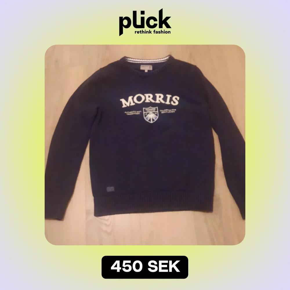 Säljer en snygg mörkblå tröja från Morris med vit text och emblem på bröstet. Tröjan är i ett mjukt material och har långa ärmar samt ribbade kanter vid ärmslut och nederkant. Perfekt för kyliga dagar! OBS pris kan diskuteras!