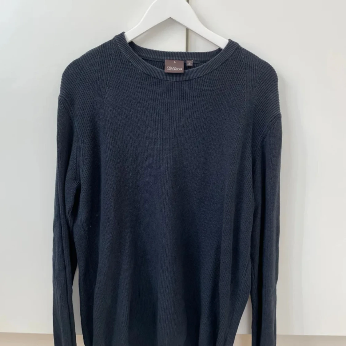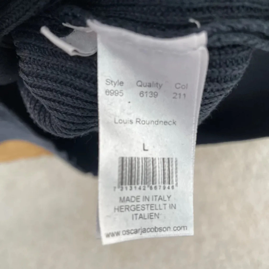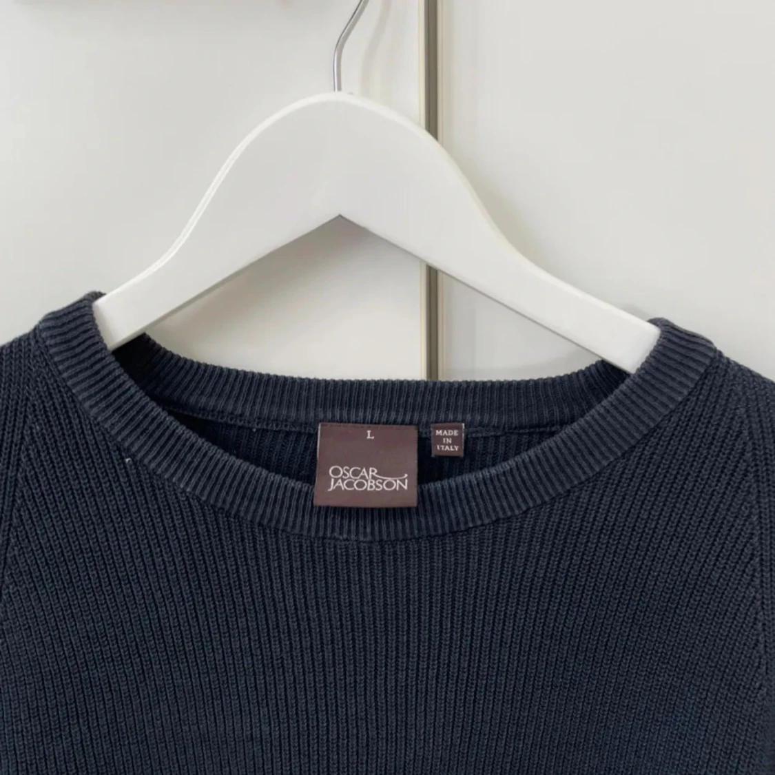 Säljer en stilren mörkblå tröja från Oscar Jacobson. Tröjan är tillverkad i 100% bomull och har en rund halsringning. Perfekt för en klassisk och bekväm look. Tillverkad i Italien.