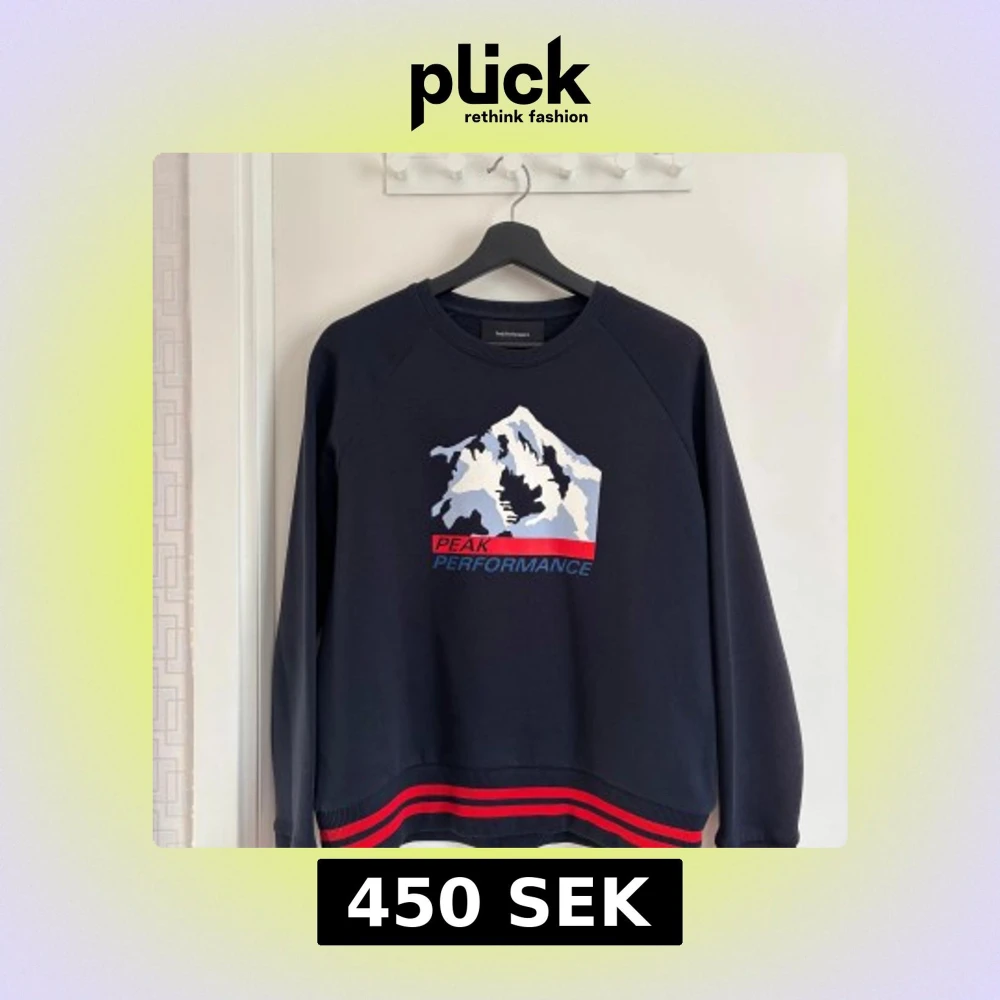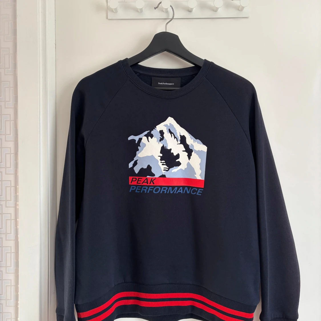 Säljer en mörkblå tröja från Peak Performance med ett bergsmotiv och texten 'Peak Performance' i rött och blått. Tröjan har långa ärmar och röd-svart randig detalj vid nederkanten. Perfekt för en sportig look!
