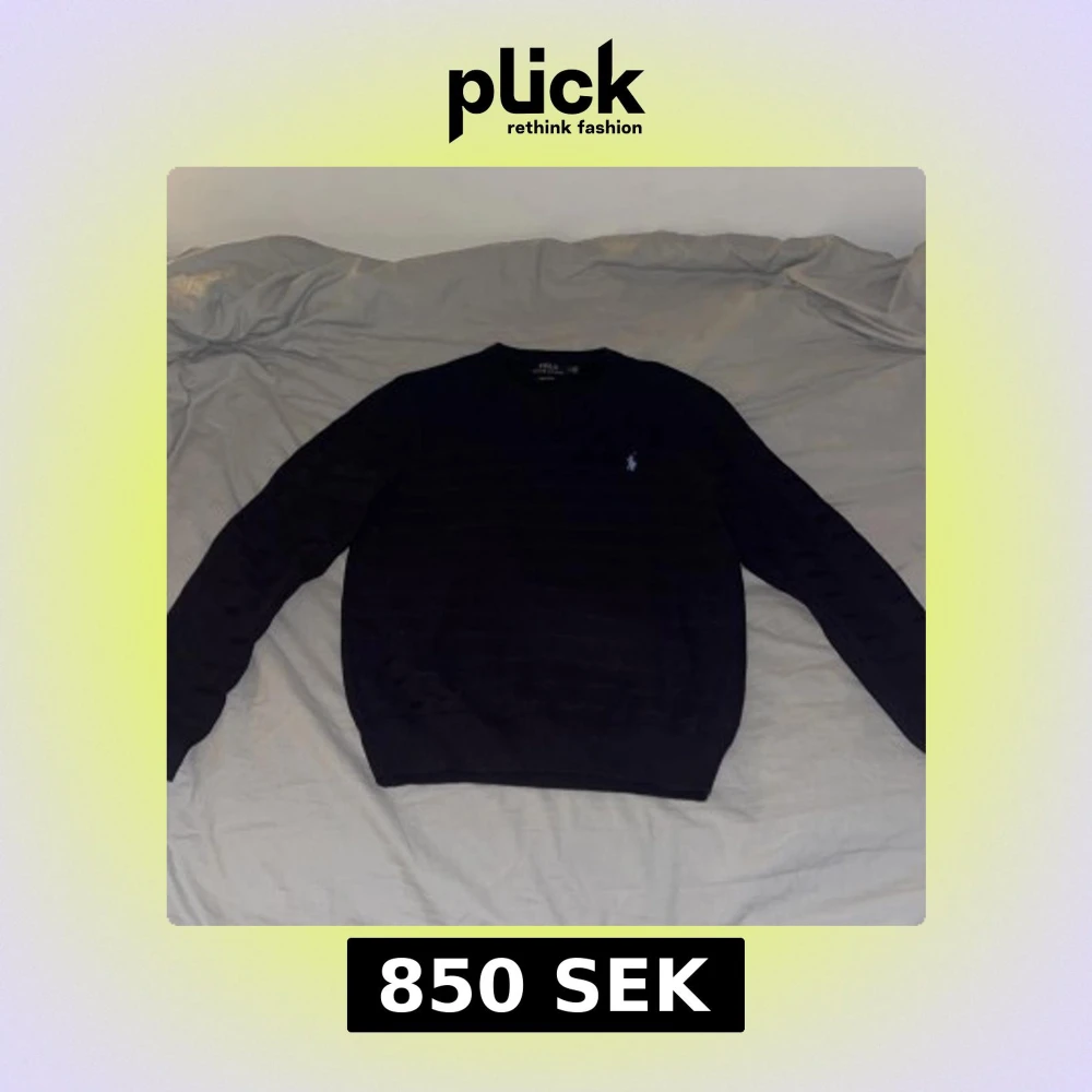 Säljer en mörkblå tröja från Polo Ralph Lauren i mjuk pima bomull. Tröjan har diskret vågigt mönster, rund halsringning och den klassiska broderade loggan på bröstet. Perfekt för dig som gillar stilrena och tidlösa plagg.