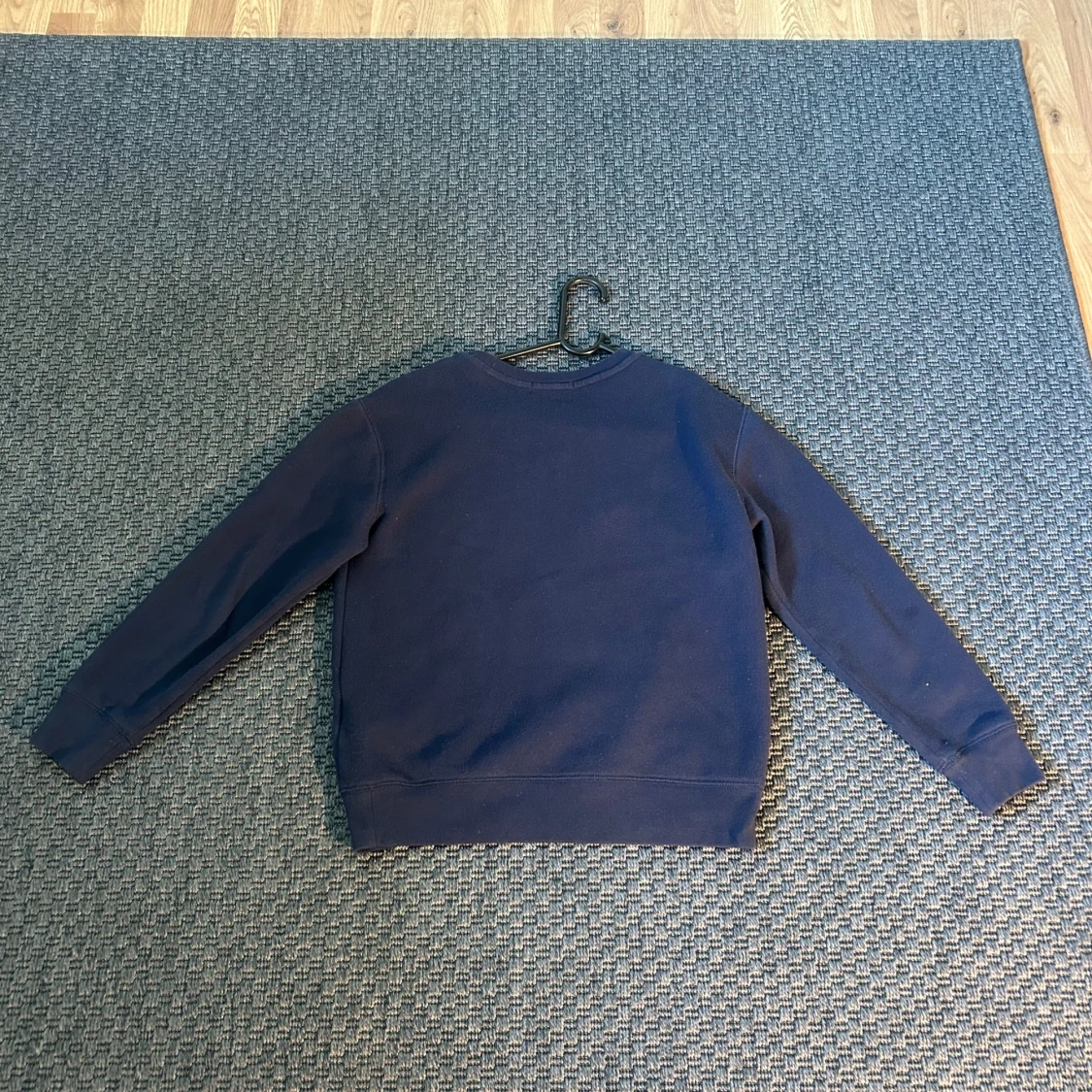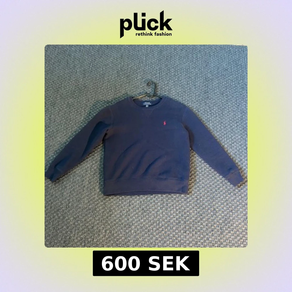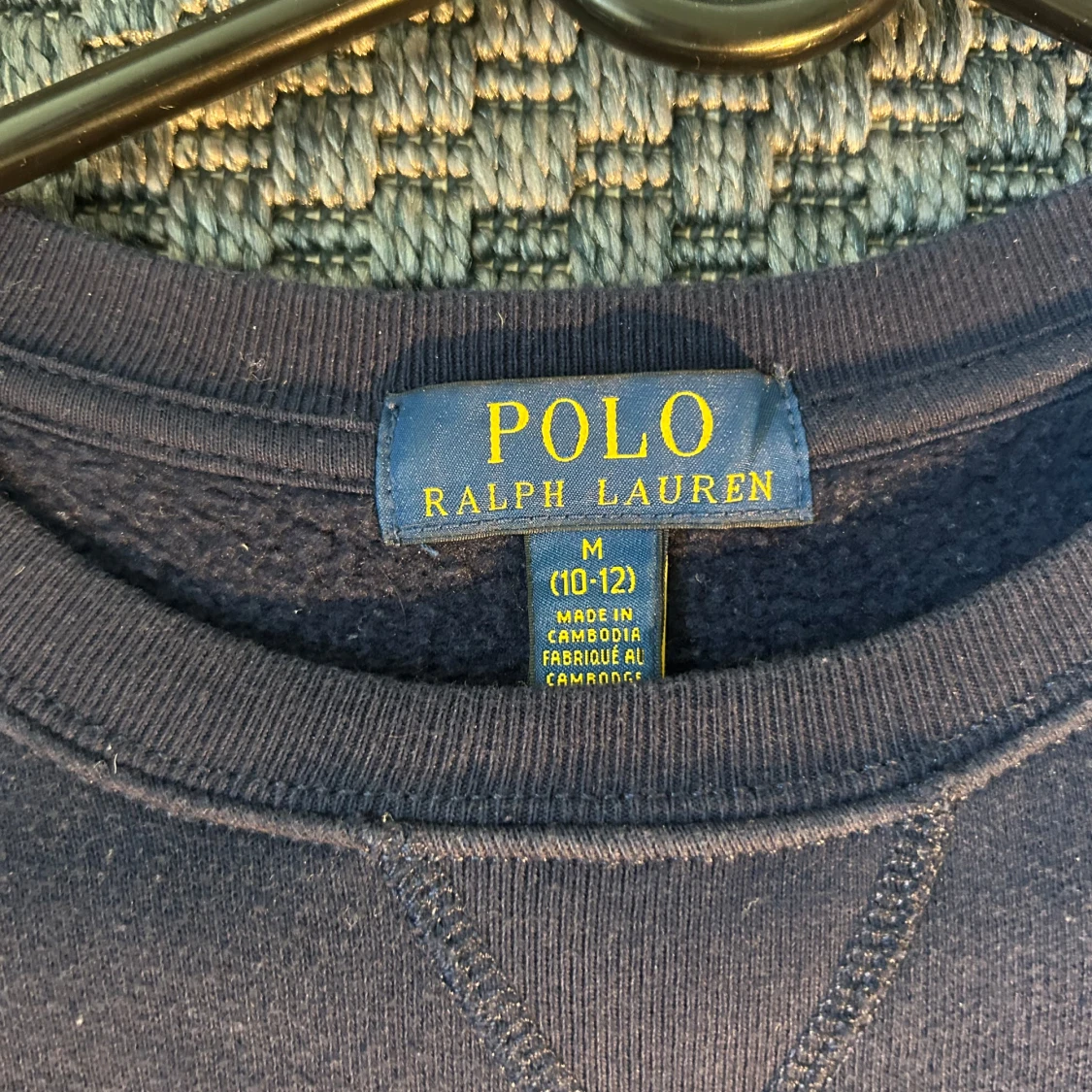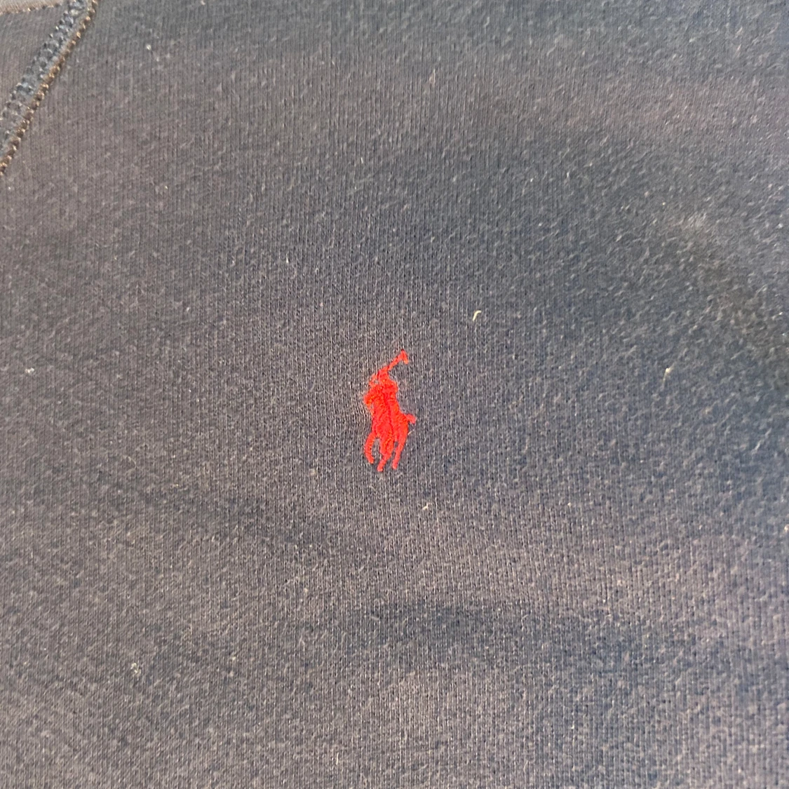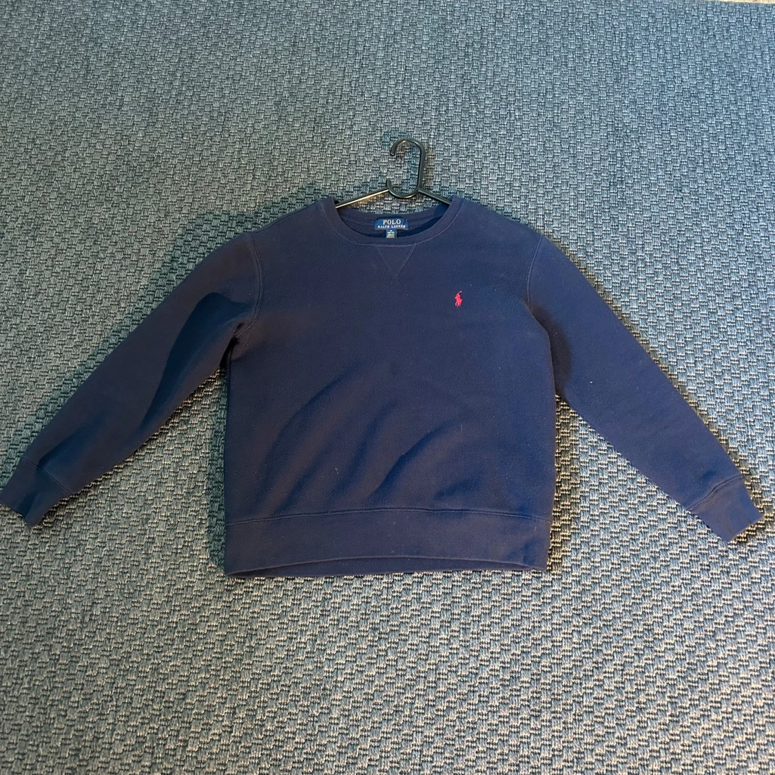 Säljer en stilren mörkblå tröja från Polo Ralph Lauren med det klassiska röda logotypbroderiet på bröstet. Storlek 156-162. Tröjan har långa ärmar och en rund halsringning. Perfekt för en avslappnad och snygg look.