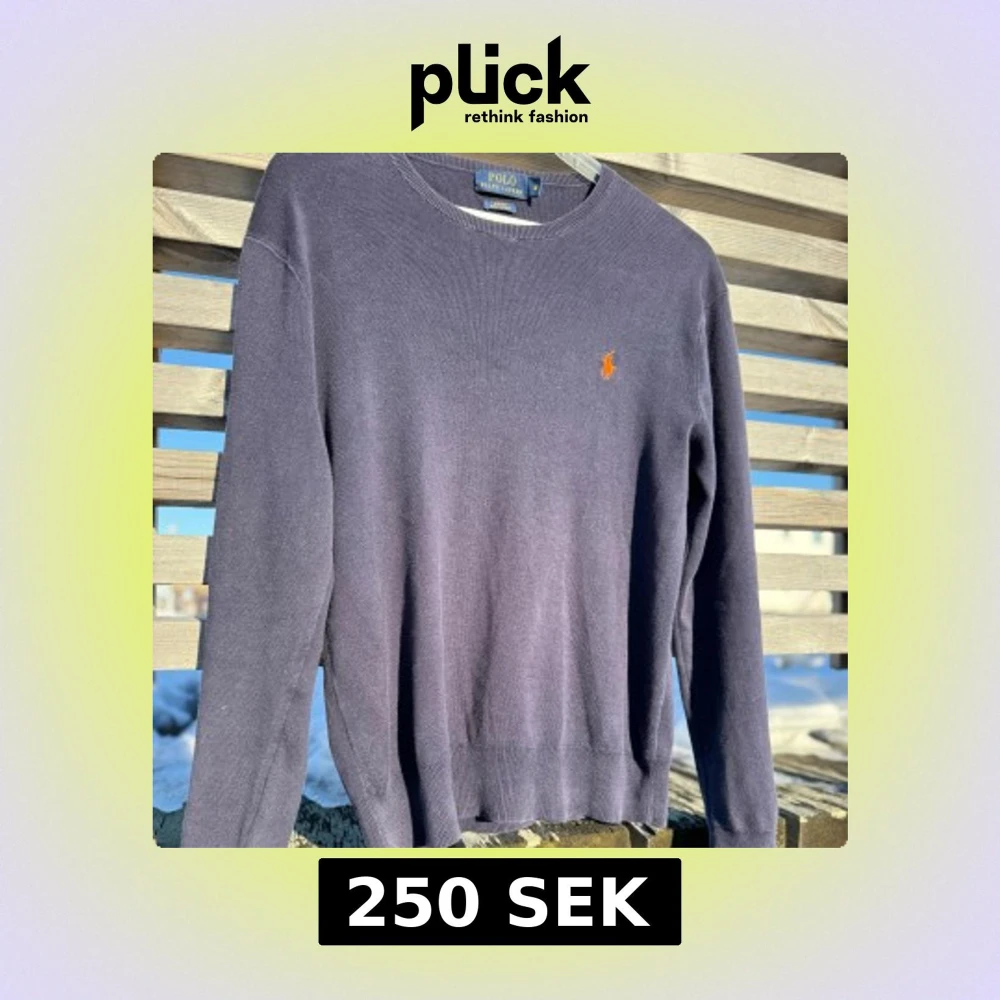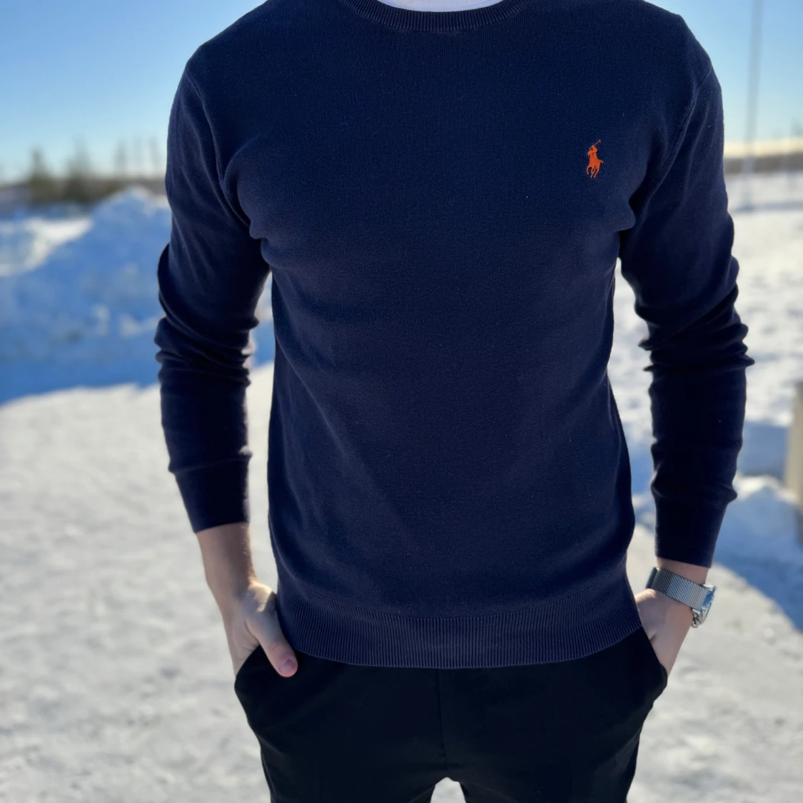 Säljer en stilren mörkblå tröja från Ralph Lauren med det klassiska broderade logotypen i orange på bröstet. Tröjan har långa ärmar och en rund halsringning. Perfekt för en avslappnad men ändå elegant look.