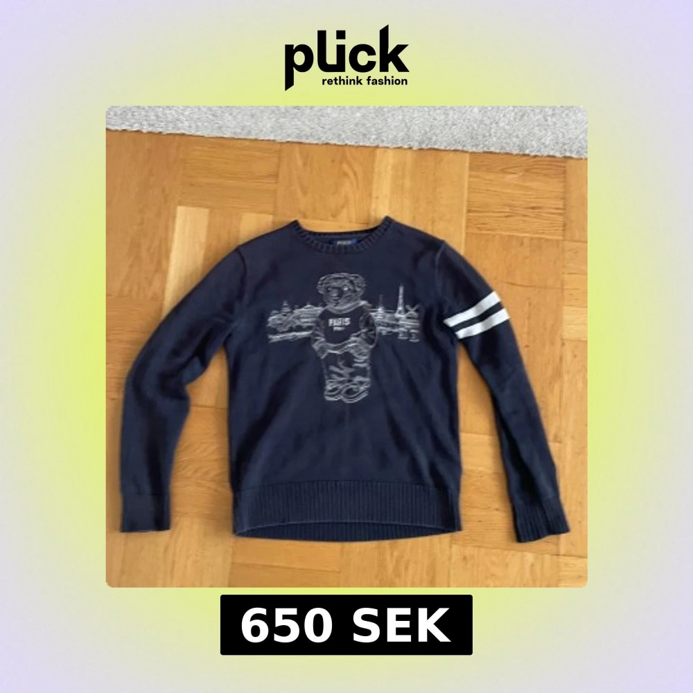 Säljer en snygg mörkblå tröja från Ralph Lauren med ett broderat motiv av en björn och texten 'Paris Polo'. Tröjan har långa ärmar och en vit rand på ena ärmen. Perfekt för en stilren look! Storlek är xl 18-20 barn storlek