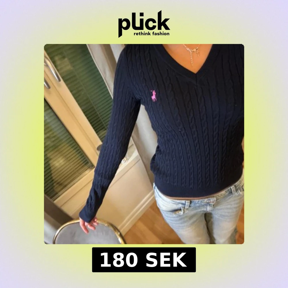 Säljer en stilren mörkblå kabelstickad tröja från Ralph Lauren med en rosa broderad logotyp på bröstet. Tröjan har en v-ringad hals och långa ärmar, perfekt för en klassisk look. Passar bra till jeans eller kjol för en avslappnad men elegant stil.