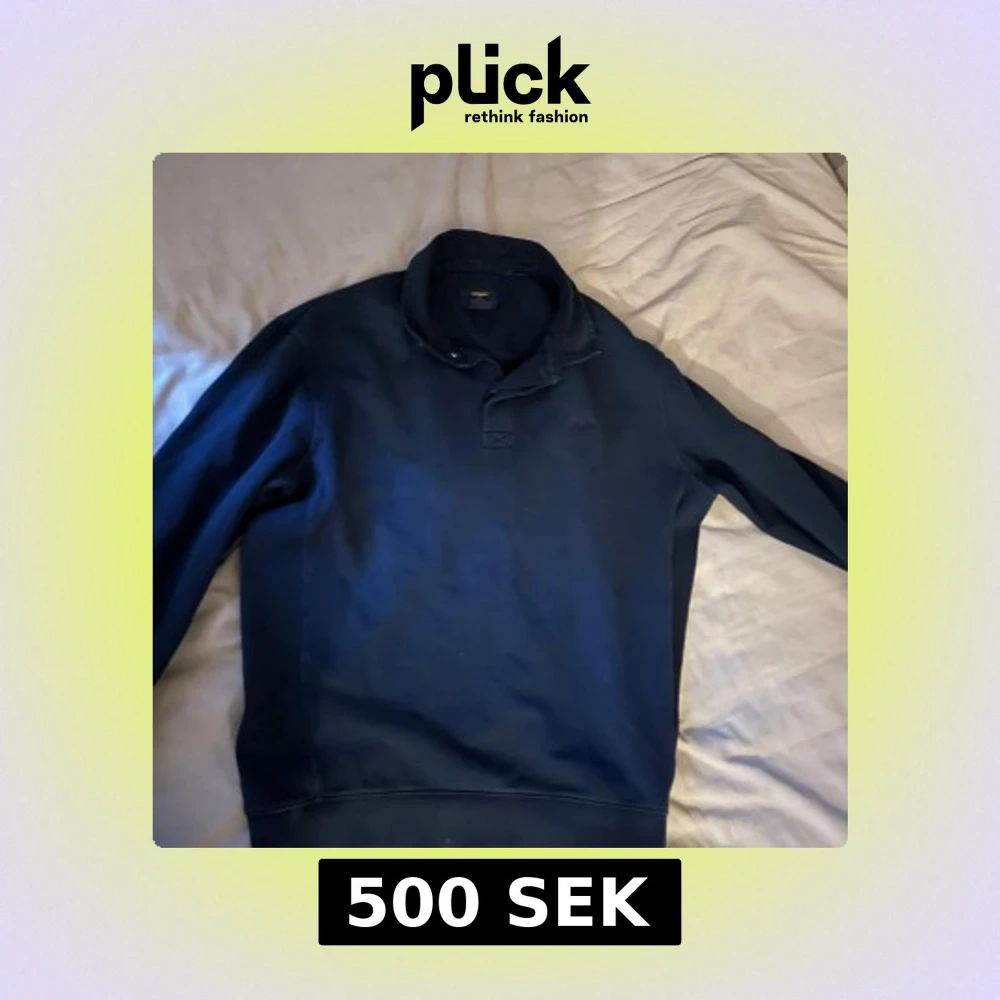 Säljer en mörkblå tröja från Superdry med en stilren design. Tröjan har långa ärmar och en hög krage med knappdetalj. Perfekt för en avslappnad stil.