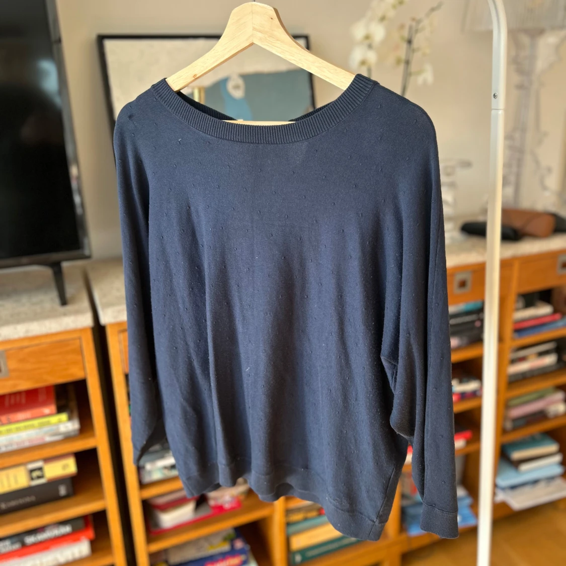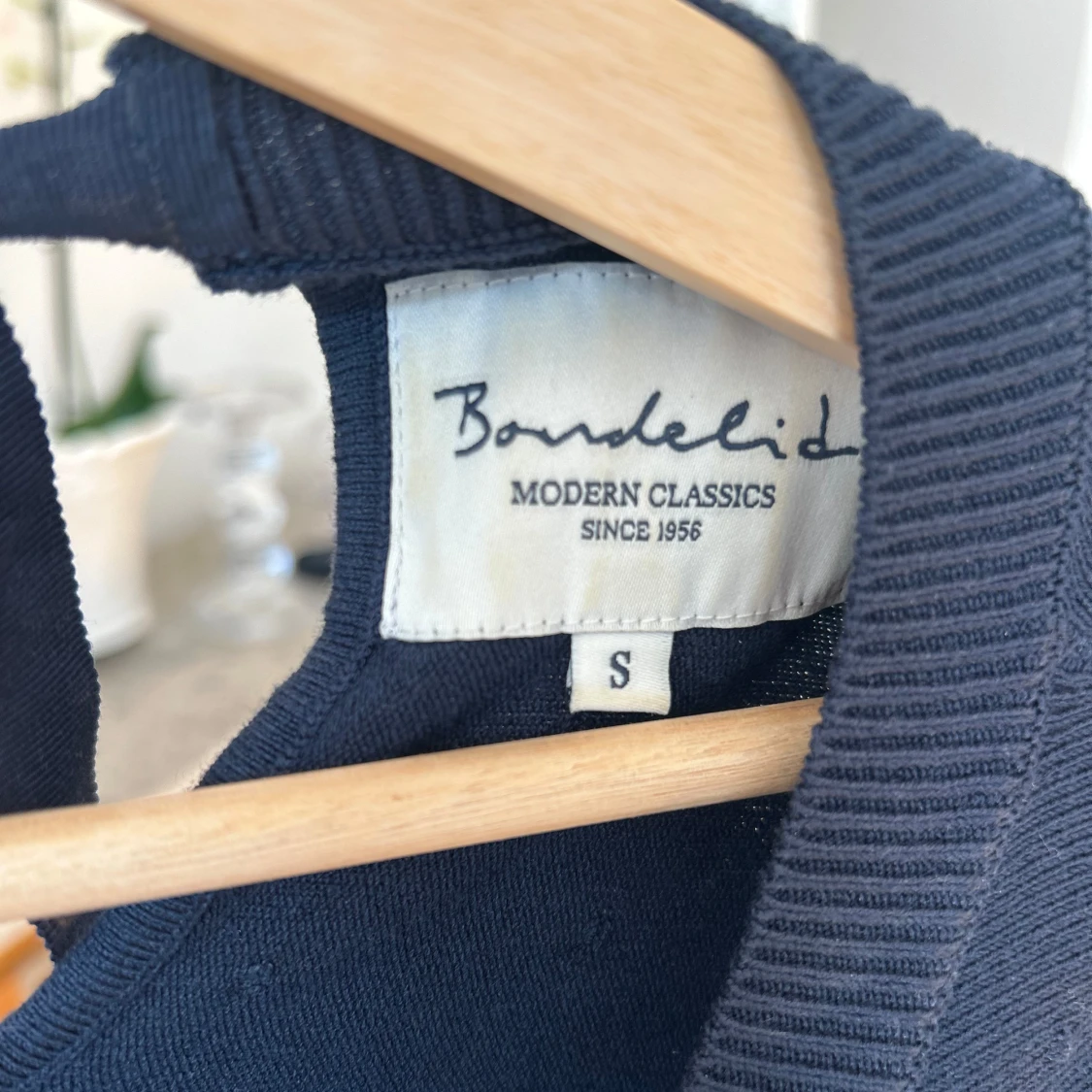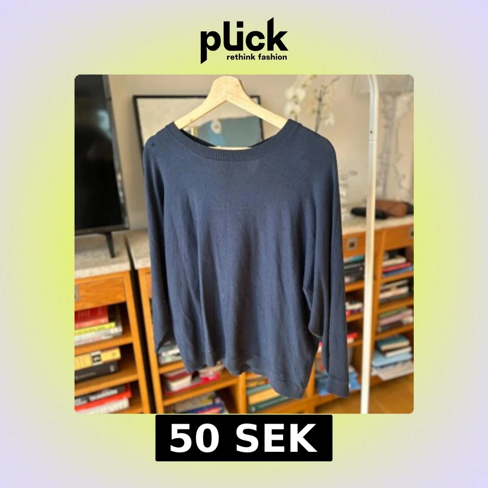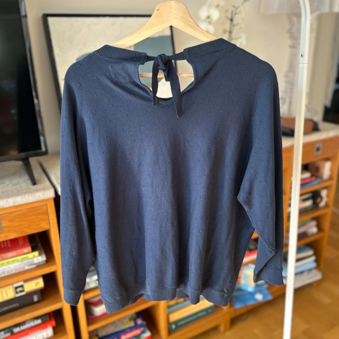 Säljer en stilren mörkblå tröja från Bondelid med knytning i nacken. Tröjan har långa ärmar och en ribbad kant vid halsen. Perfekt basic topp.