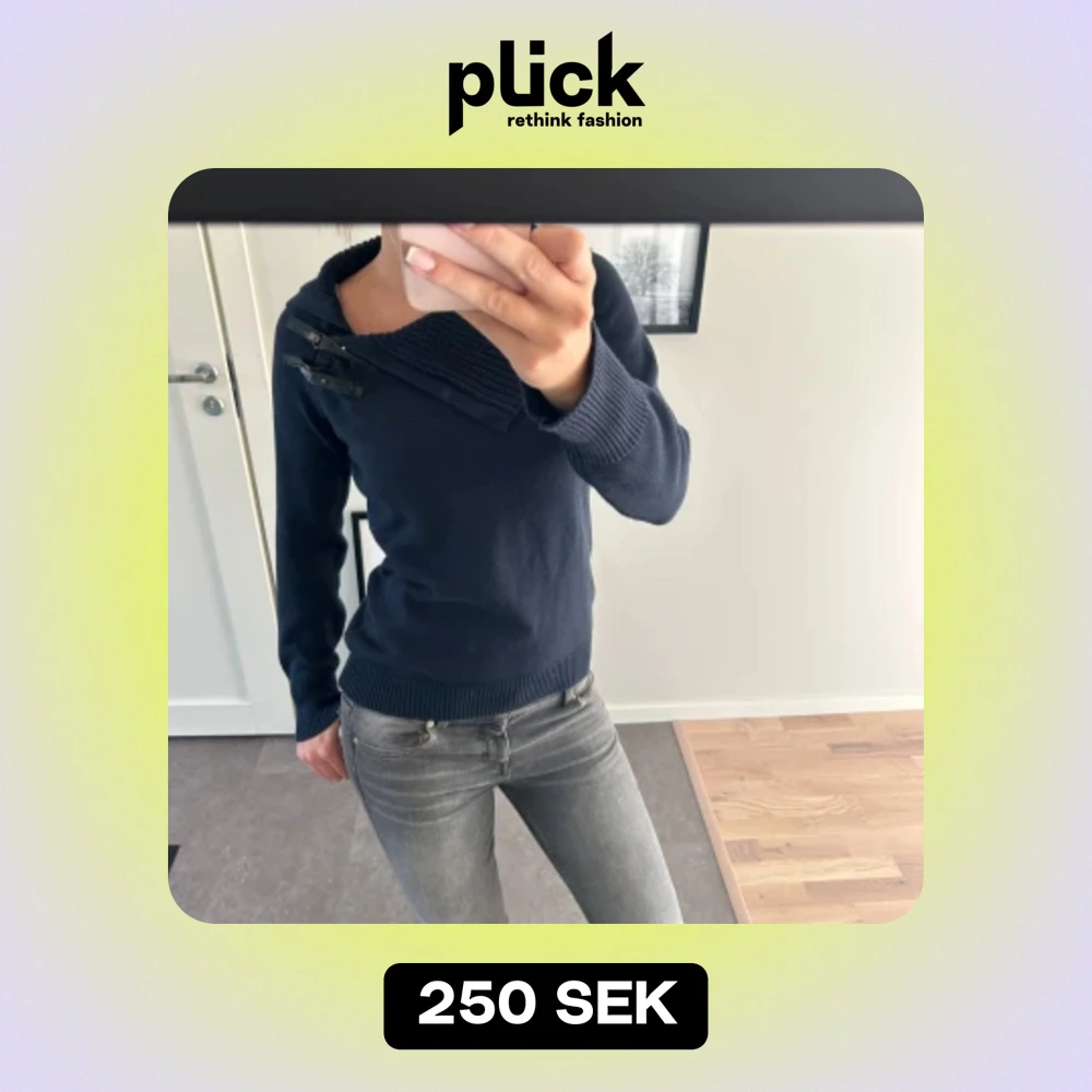 Mörkblå tjocktröja med en detalj vid axeln. Storlek M men skulle säga att den passar S väldigt bra också. Bra skick då tröjan aldrig kommit till användning.