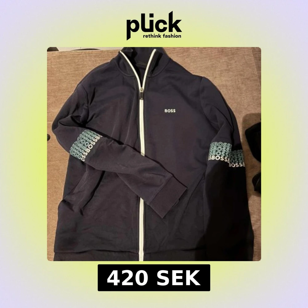 Snygg mörkblå tröja från BOSS med vit dragkedja och logga på bröstet. Ärmarna har tryckt BOSS-mönster i vitt och ljusgrönt. Tröjan har hög krage och ribbade muddar. Perfekt för en stilren och sportig look.