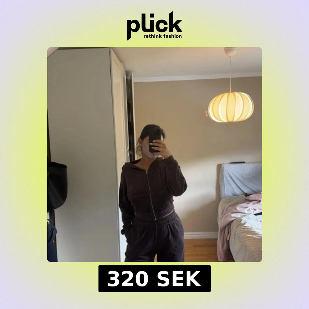 Säljer en mörkbrun croppad hoodie med dragkedja framtill och huva. Tröjan har långa ärmar och en loose passform, perfekt för chill dagar. Materialet känns mjukt och skönt mot huden. Enkel att matcha med både jeans och mjukisbyxor. tröjan kommer med matchande byxor till som du kan göra både låga å höga som på bilden