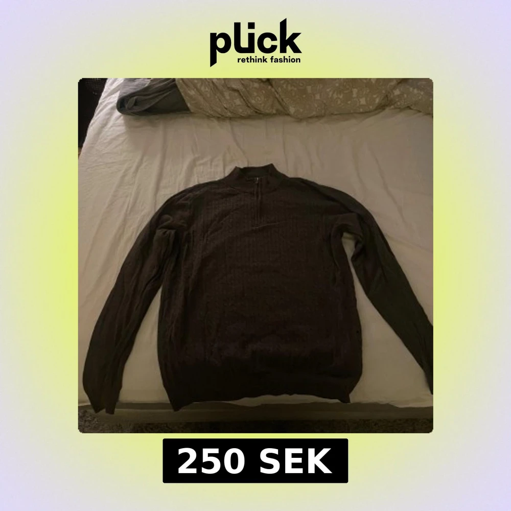 Snygg mörkbrun stickad tröja med half zip och hög krage. Tröjan har ett diskret mönster och långa ärmar, perfekt för kyliga dagar. Passar dig som gillar klassisk stil med en modern twist.