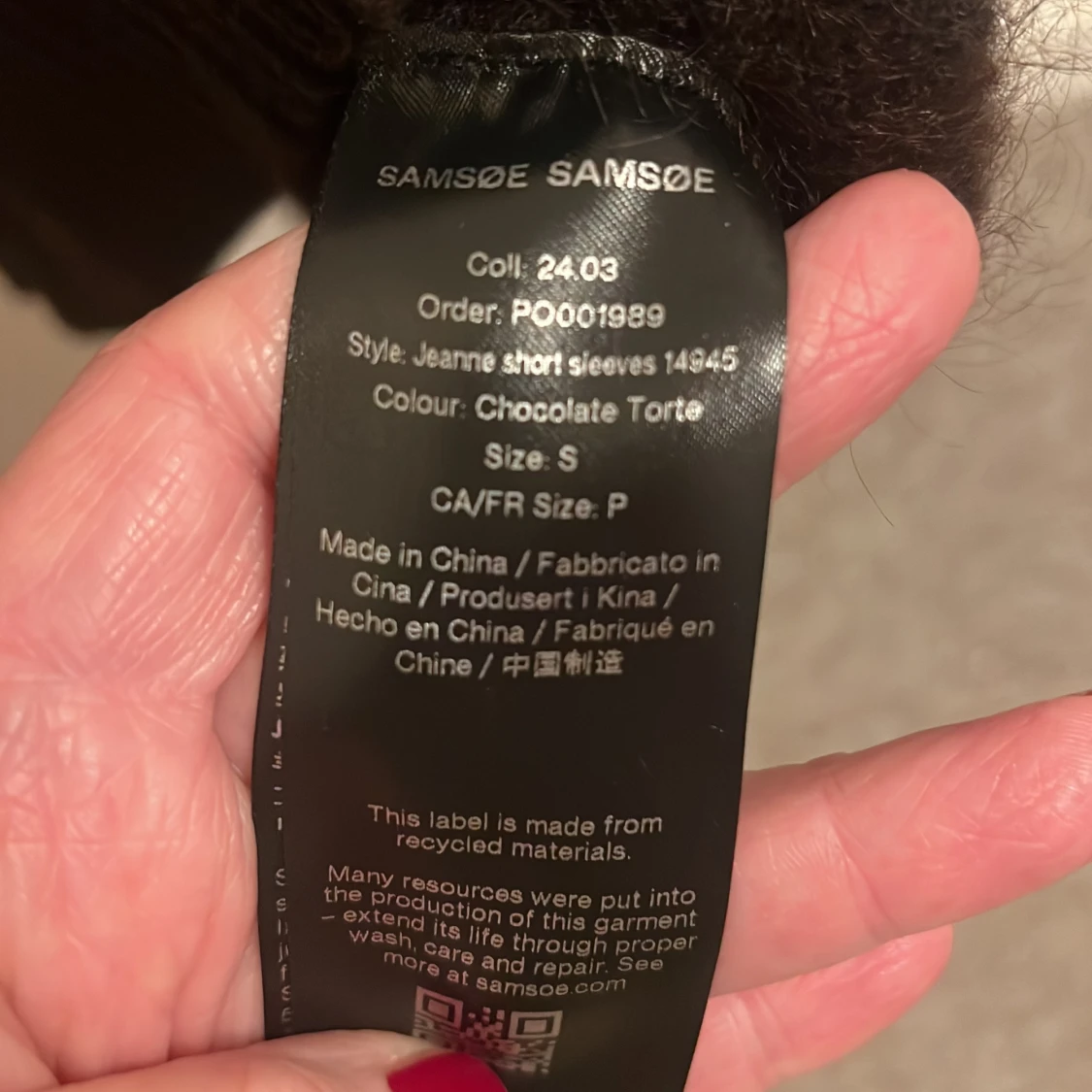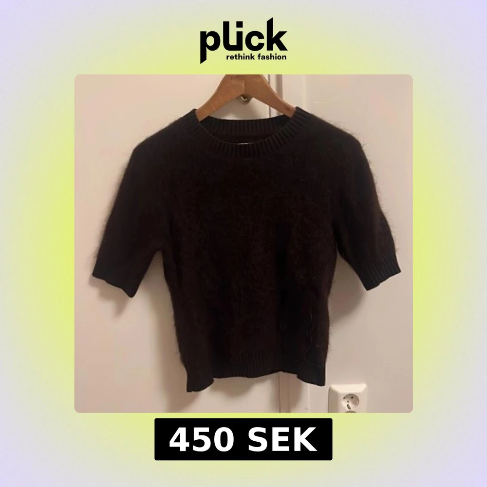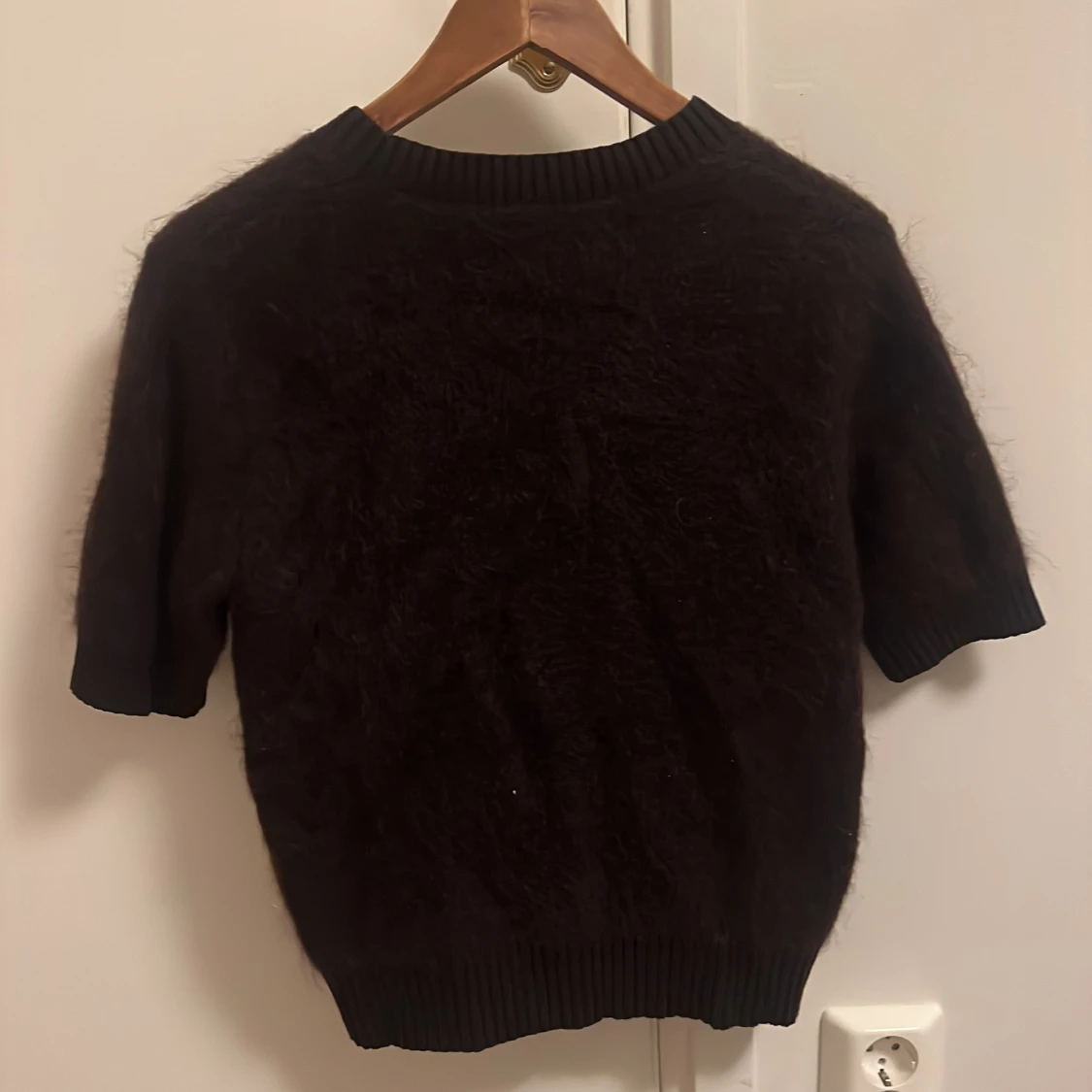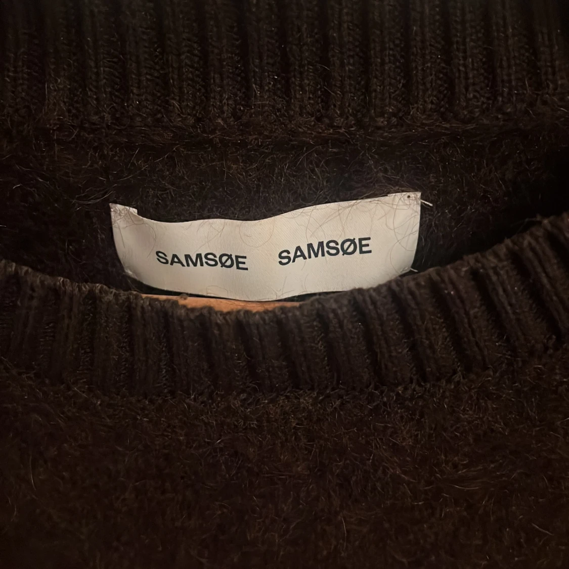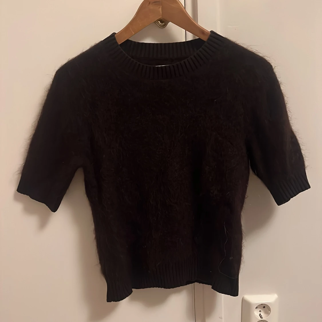 Säljer en stilren mörkbrun tröja från Samsøe Samsøe. Tröjan har en mjuk och fluffig textur med korta ärmar och rund halsringning. 34 % mohair, 34 % ull. Perfekt för en mysig och avslappnad men ändå trendig och uppklädd look. Använd två gånger.