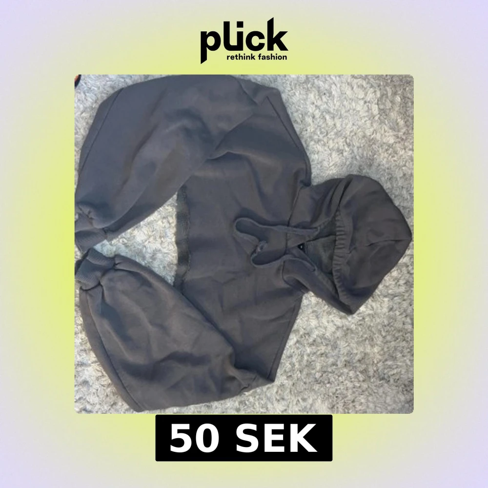Säljer en mörkgrå croppad hoodie med huva och snörning framtill. Tröjan har långa ärmar med ribbade muddar och är tillverkad i mjukt bomullsmaterial. Perfekt för en chill och avslappnad stil.