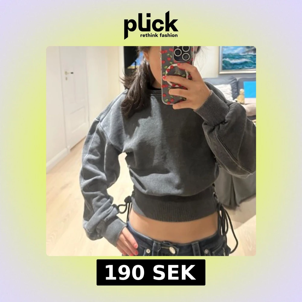 Säljer en mörkgrå croppad sweatshirt med snygg snörning i sidorna och breda muddar vid ärmslut och midja. Tröjan har lång ärm och en loose passform som ger en chill vibe. Perfekt för dig som vill ha något unikt i garderoben. Använd en gång!