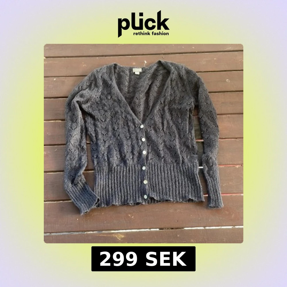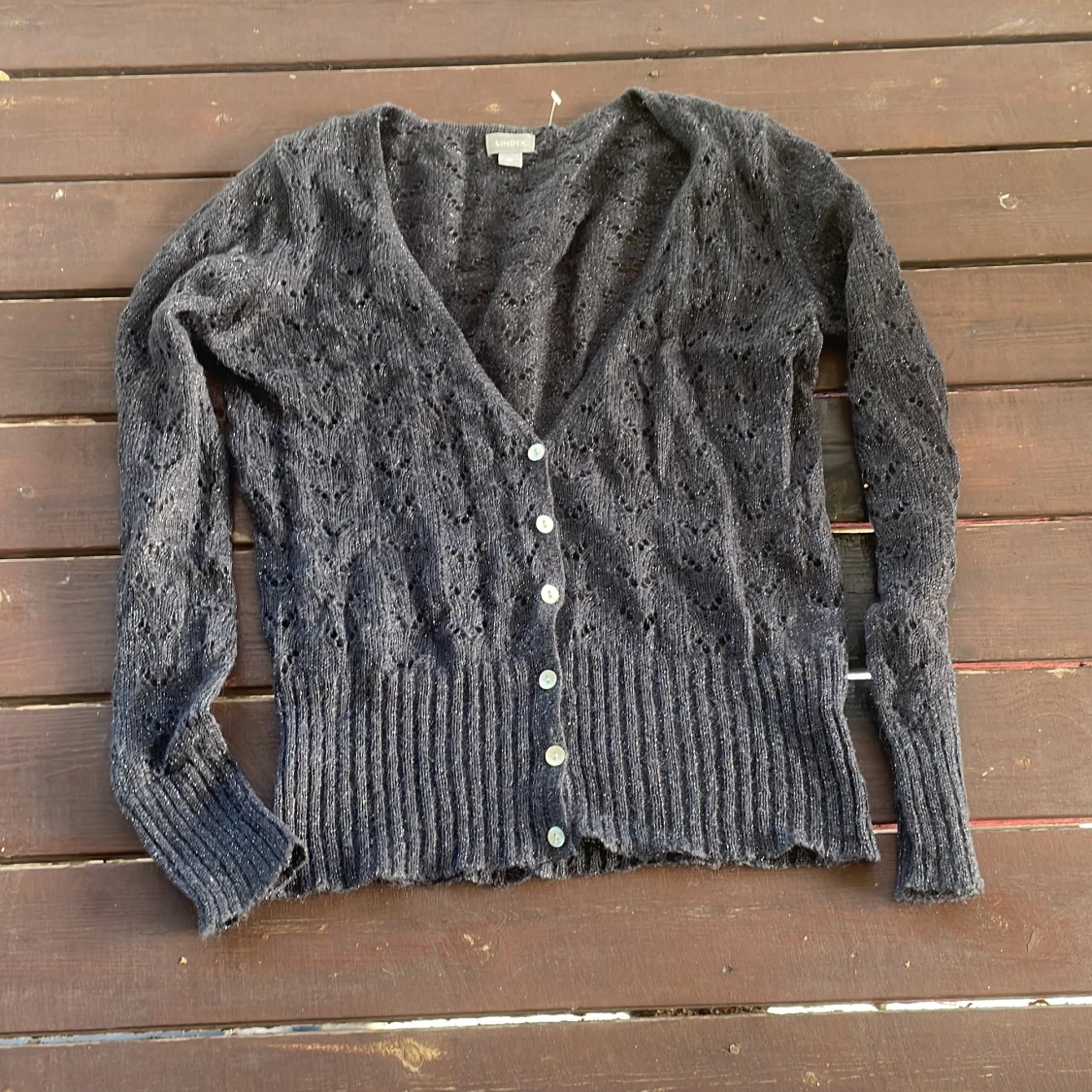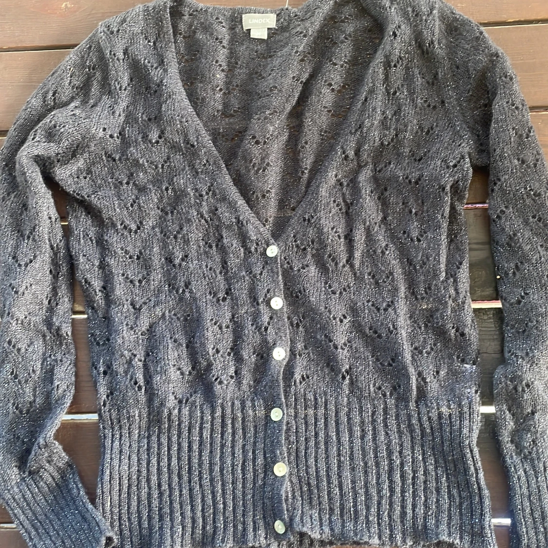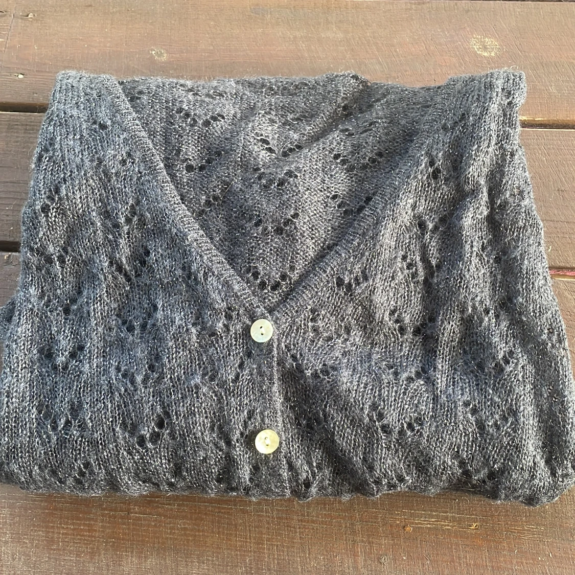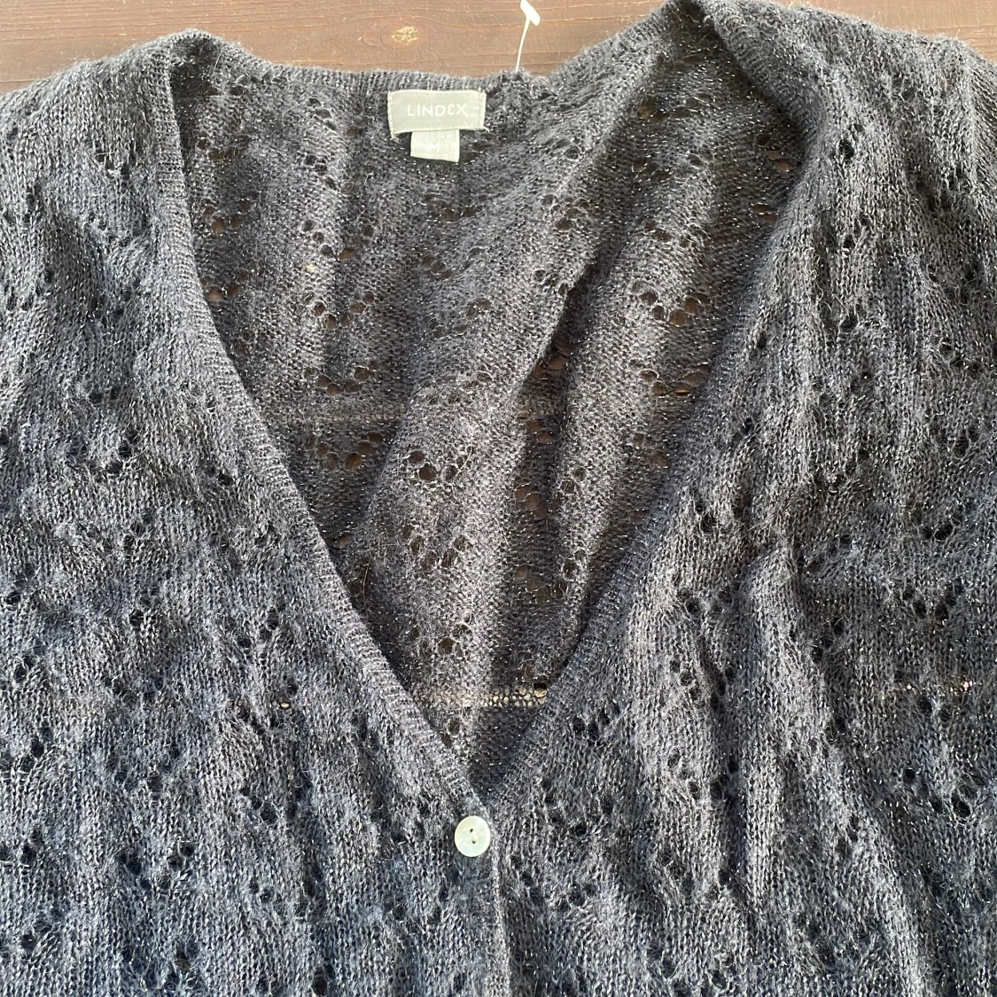 Mysig mörkblå glittrig stickad kofta från Lindex med v-ringning och fina pärlemorknappar. Koftan har ett hålmönster och bred ribbad kant nedtill och vid ärmsluten. Perfekt att slänga över en topp för en chill look.