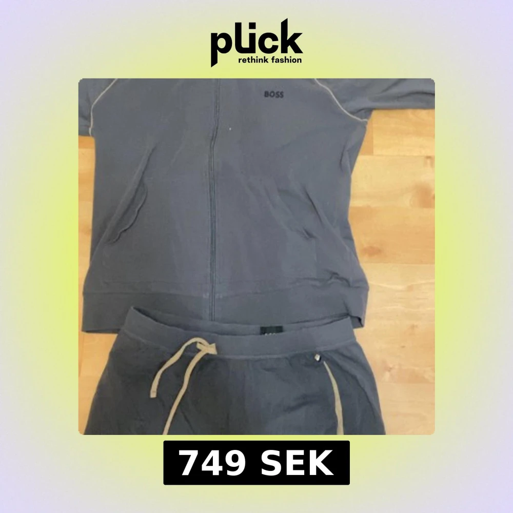 Snygg mörkgrå set från BOSS med dragkedja framtill och diskret logga på bröstet. Tröjan har långa ärmar, fickor på sidorna och kontrastdetaljer längs axlarna. Perfekt för chill eller träning, riktigt skön och stilren.
