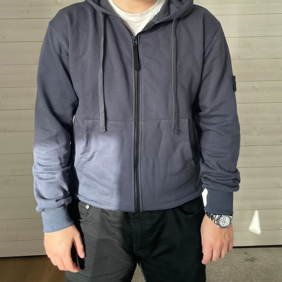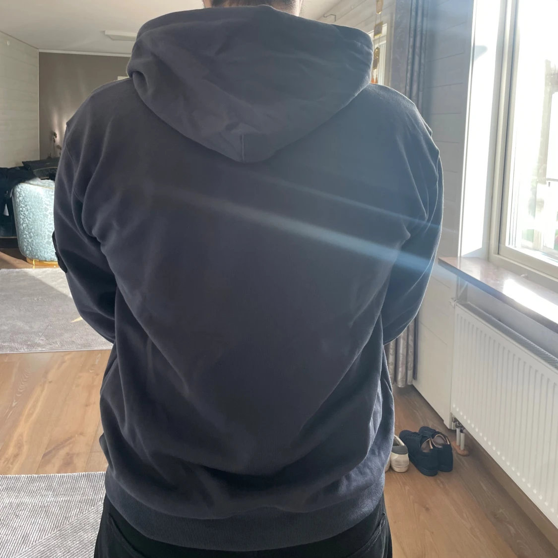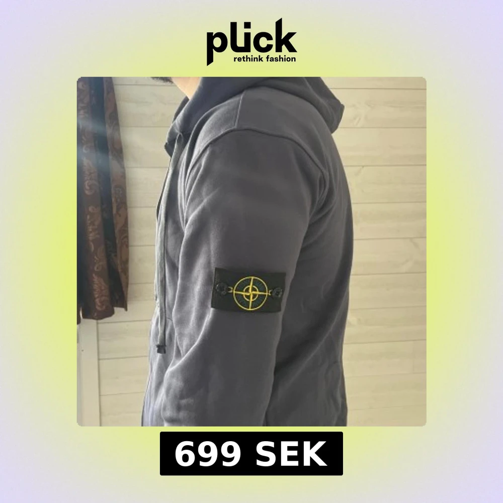 Säljer en mörkgrå hoodie från Stone Island med ikonisk patch på ärmen. Tröjan har huva med snörning, dragkedja framtill och ribbade muddar. Tillverkad i mjuk bomull, perfekt för chill dagar. Snygg och enkel design som alltid funkar.