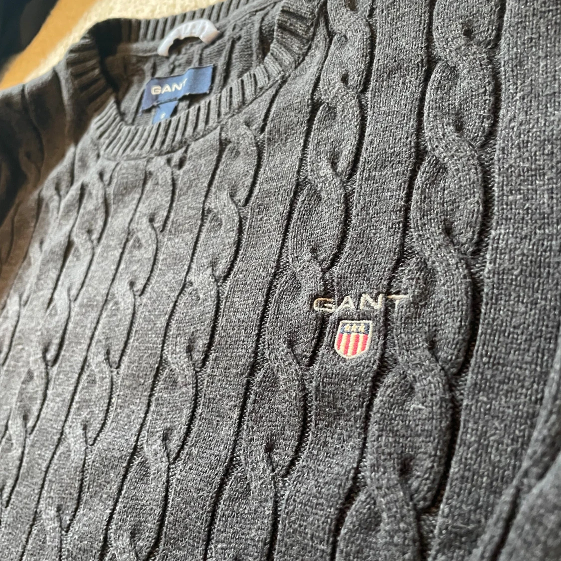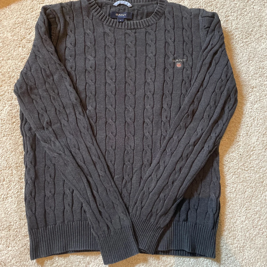 Mörkgrå kabelstickad tröja från GANT med rund halsringning och broderad logga på bröstet. Tröjan har ribbade muddar vid ärmslut och nederkant, och är långärmad. Perfekt för dig som gillar klassisk och stilren look.