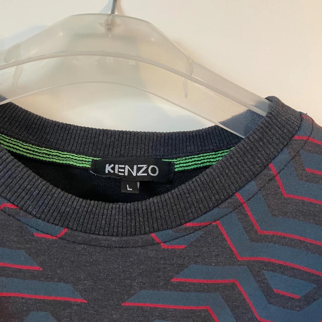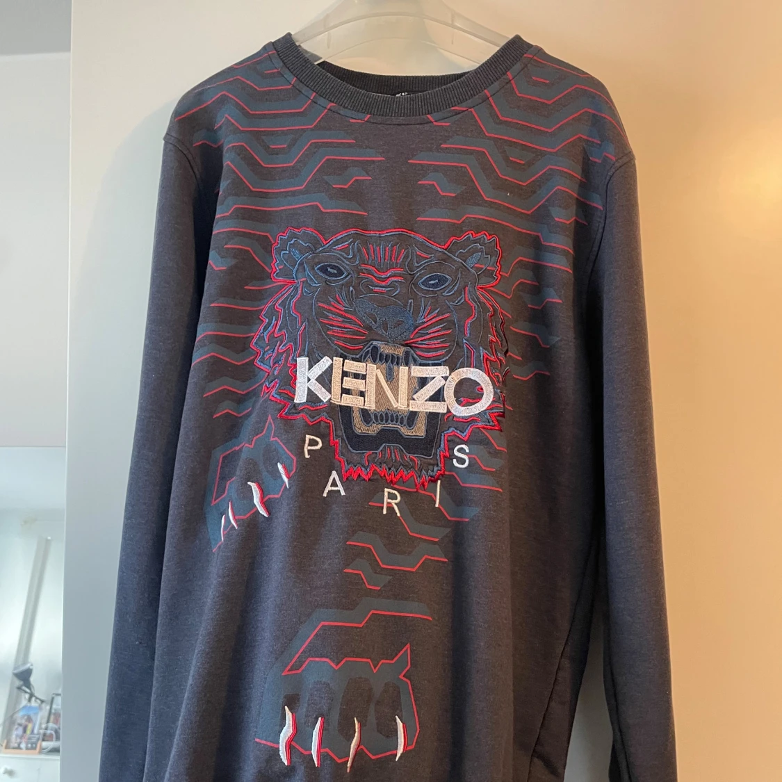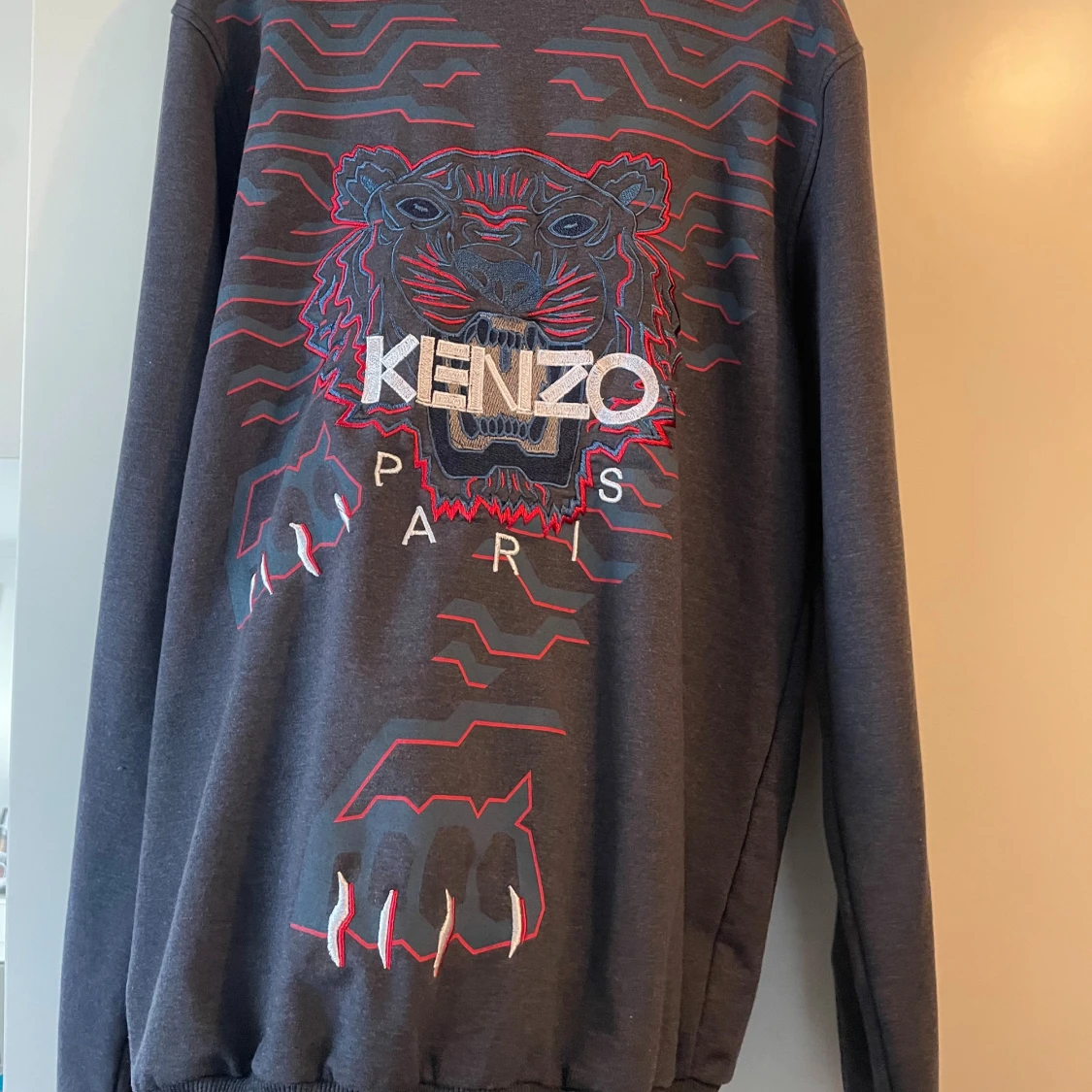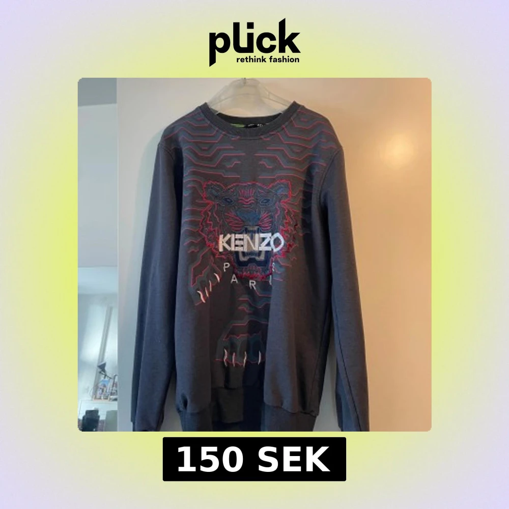 Säljer en mörkgrå sweatshirt från Kenzo med ikoniskt broderat tigerhuvud och logga på bröstet.