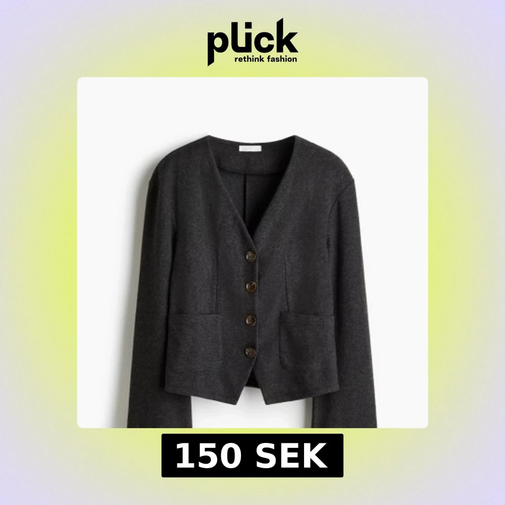 Snygg mörkgrå cardigan jacka från H&M med fyra knappar framtill och två stora fickor. Jackan har en v-ringad design och är långärmad, perfekt för lager-på-lager. Materialet är mjukt och känns skönt mot huden, tillverkad i ullblandning.