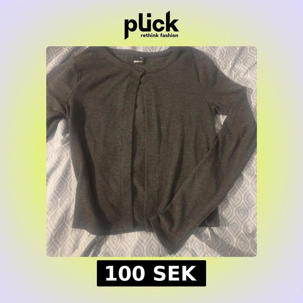 En stilren mörkgrå kofta från Gina Tricot med rund halsringning och långa ärmar. Koftan har en enkel design utan synliga knappar och är tillverkad i ett mjukt, stickat material som passar perfekt till lager-på-lager-stil.