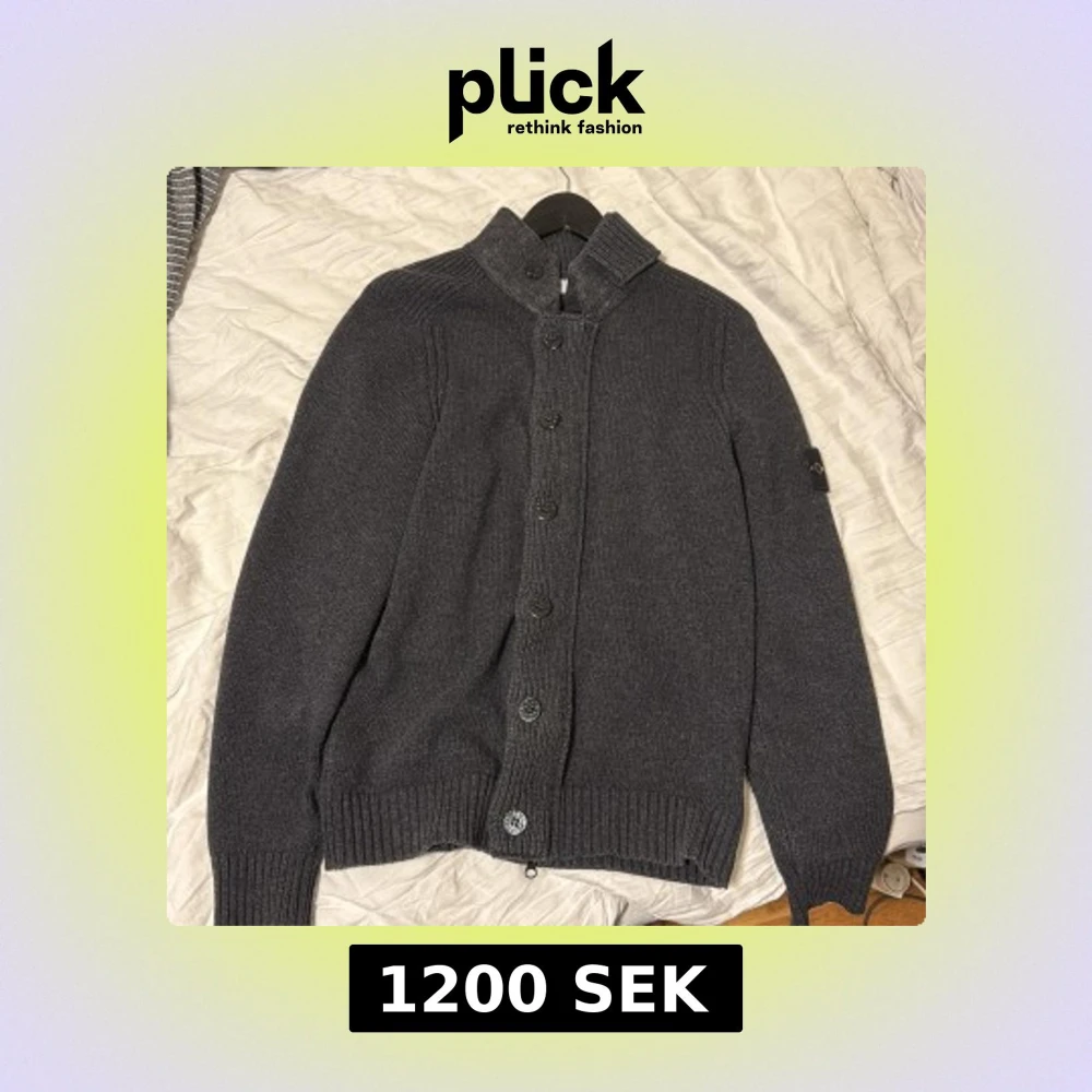 Säljer en mörkgrå stickad kofta från Stone Island med ribbade muddar, hög krage och både dragkedja och knappar framtill. Klassisk logga på ärmen. Perfekt för lager-på-lager under höst och vinter.