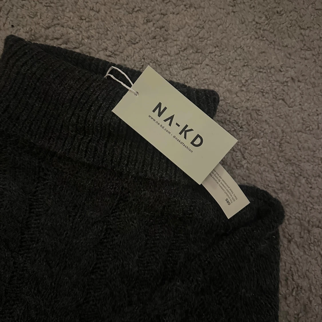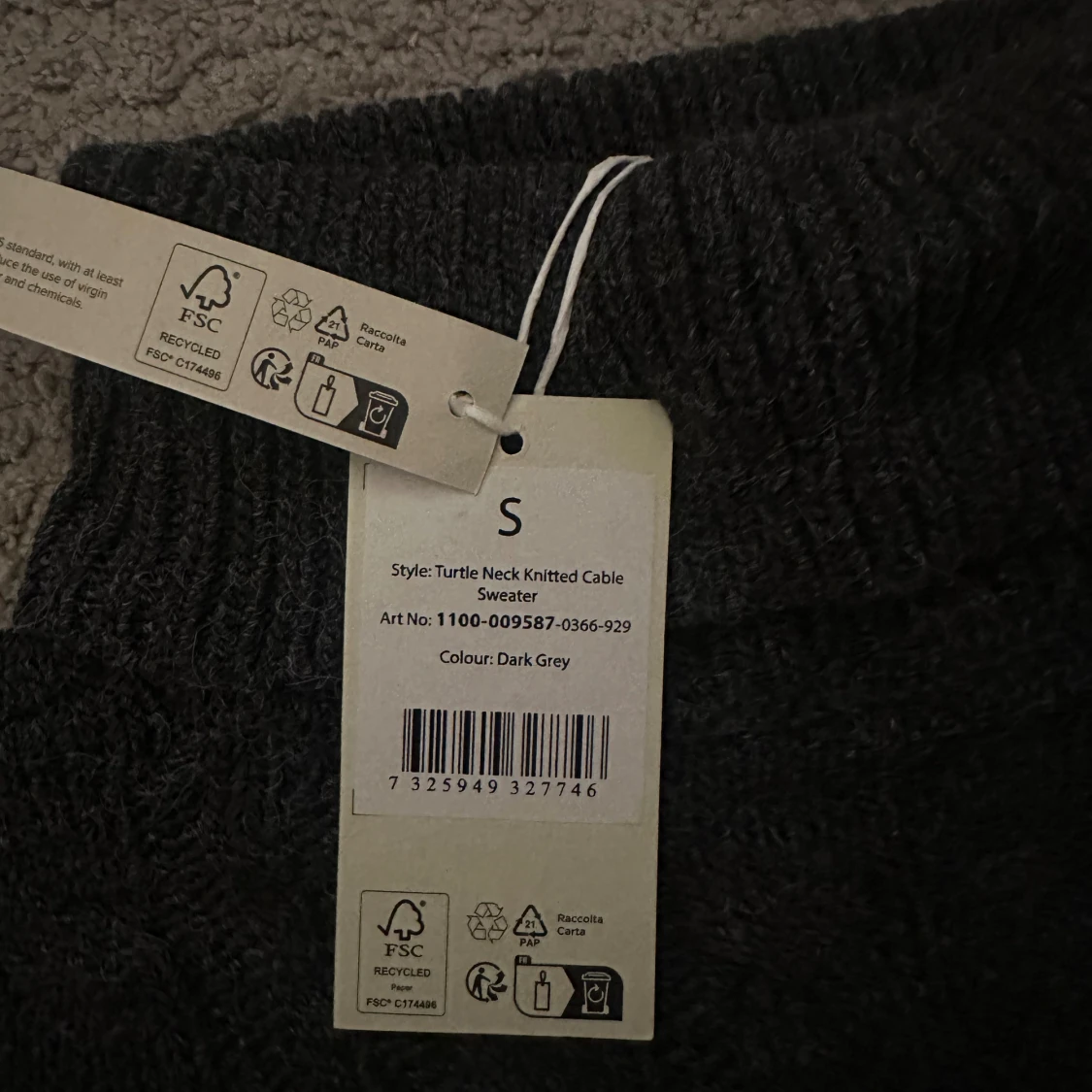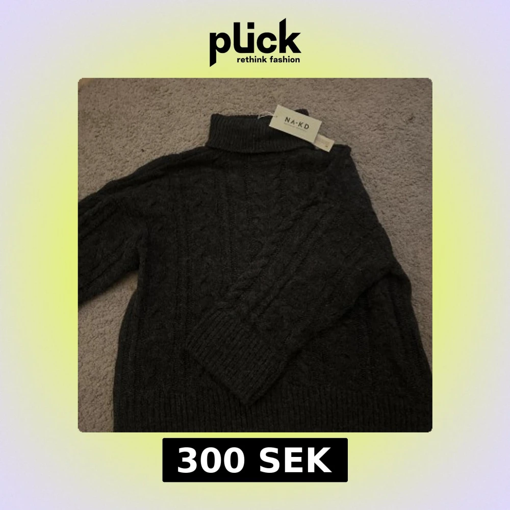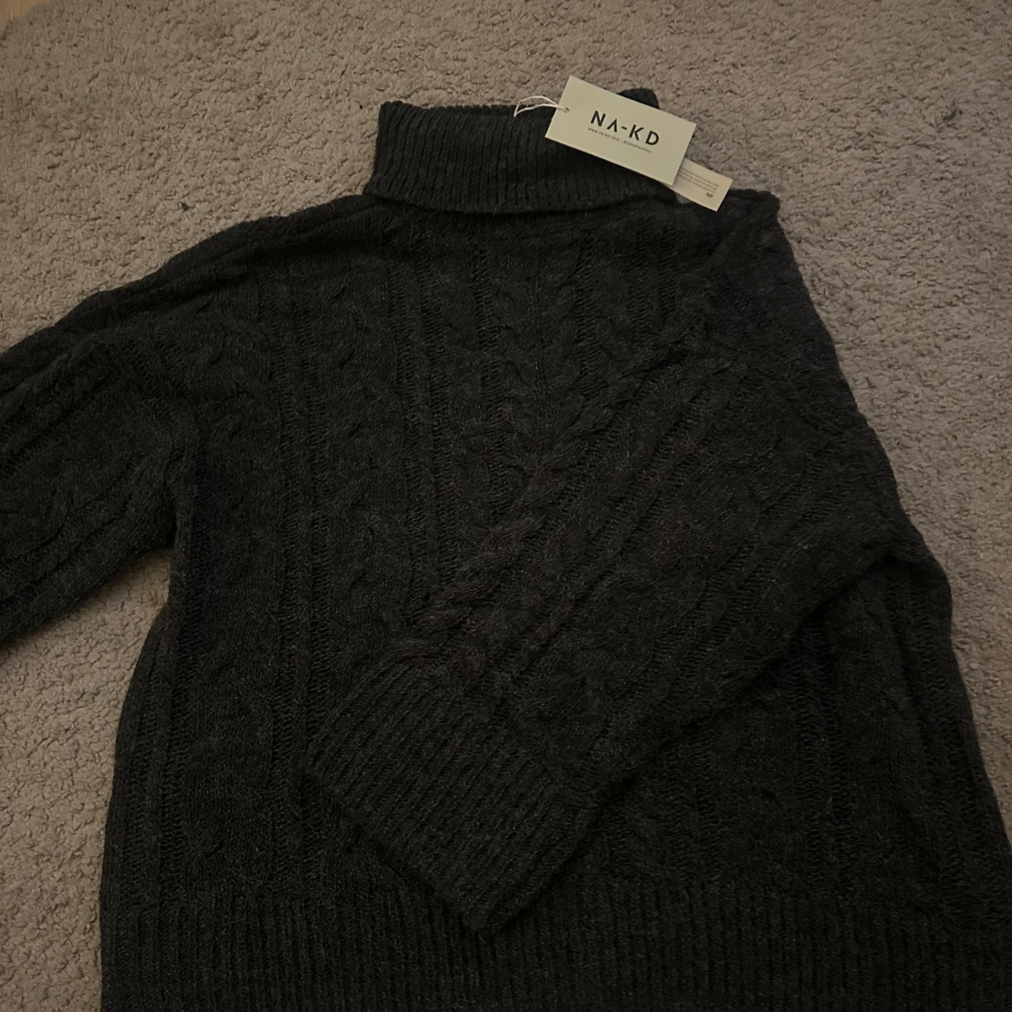 Mysig mörkgrå polotröja från NA-KD med kabelstickat mönster. Tröjan har hög polokrage, långa ärmar och breda ribbade muddar. Oanvänd med prislappen kvar.