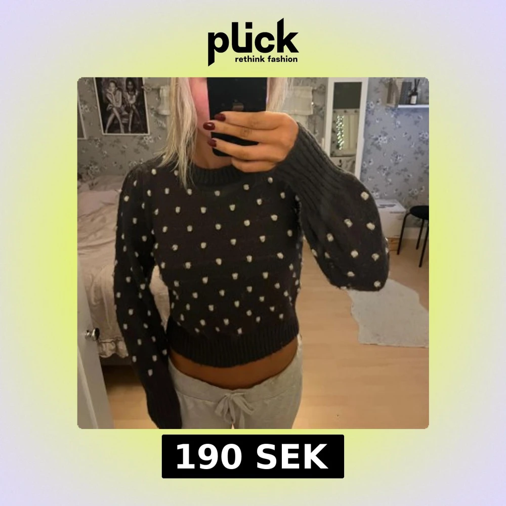 Supermysig mörkgrå stickad tröja med vita prickar och ribbade muddar. Modellen är croppad med rund hals och har långa ärmar med lite puff. Perfekt för dig som gillar en söt och chill stil. Passar dig som vill ha något mjukt och varmt till hösten eller vintern.