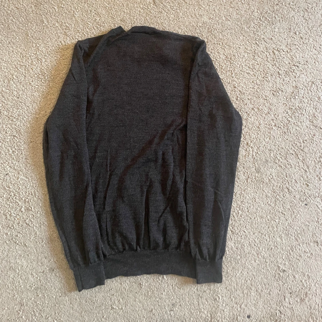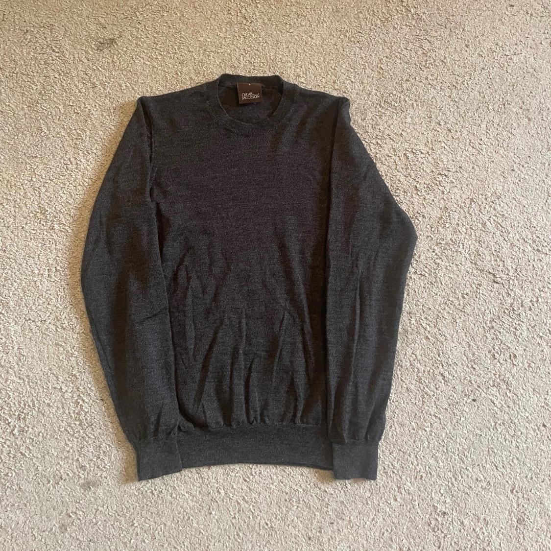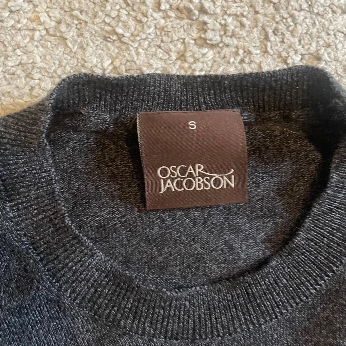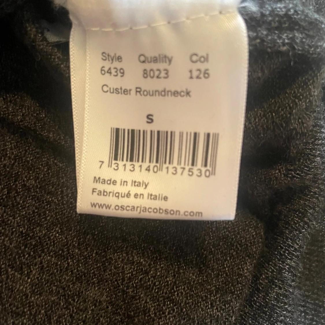 Snygg mörkgrå rundhalsad tröja från Oscar Jacobson i storlek S. Tröjan är tillverkad i Italien och har en klassisk, stilren design med ribbade muddar vid ärmslut och nederkant. Perfekt för dig som gillar enkel och tidlös stil.