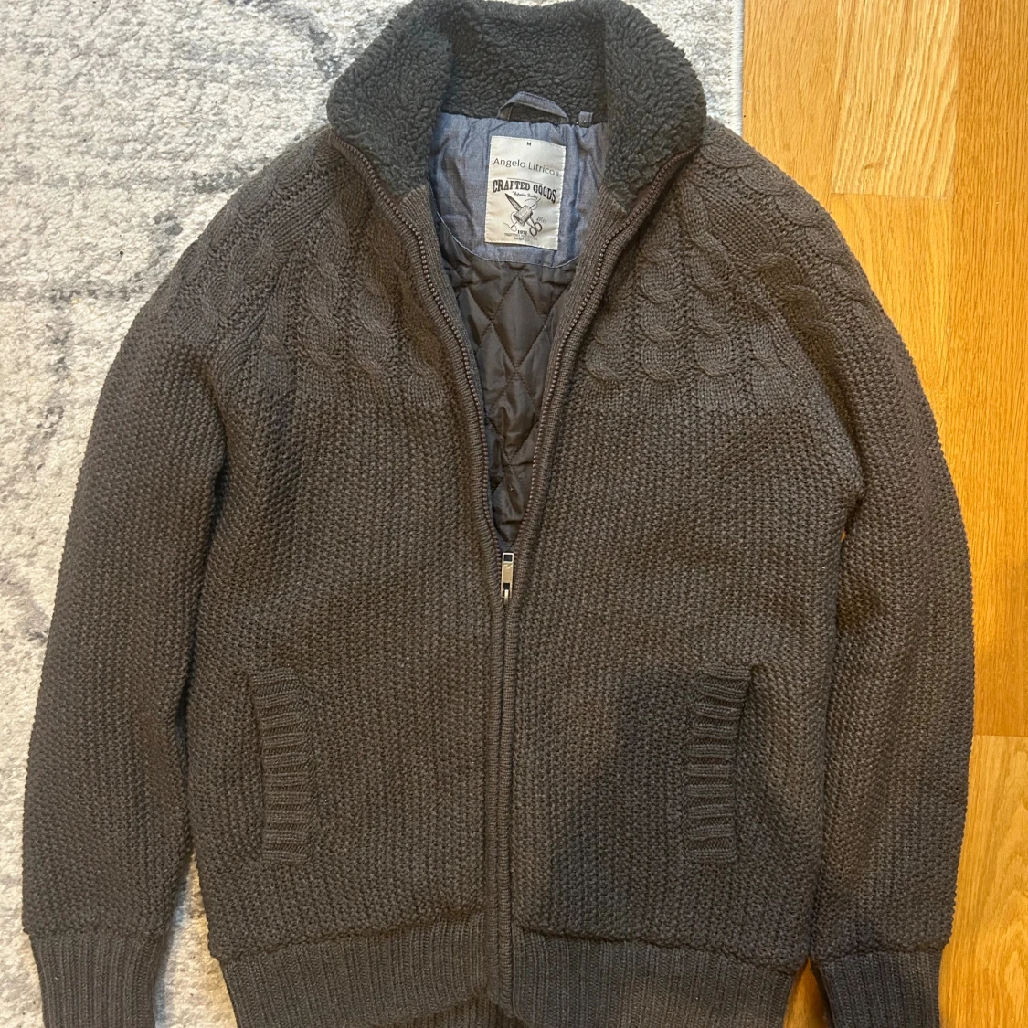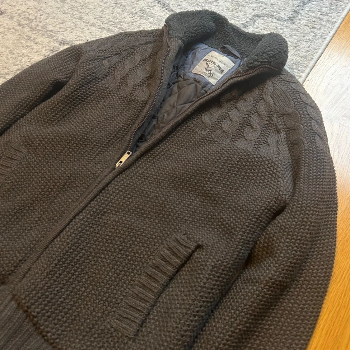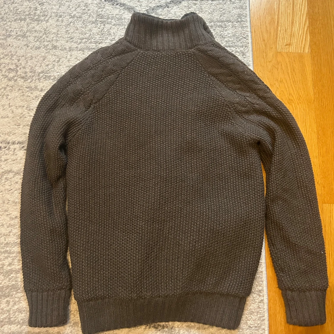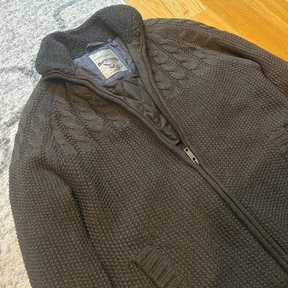 Mörkgrå stickad cardigan från med dragkedja och quiltat innerfoder. Cardiganen har kabelstickade detaljer på axlarna, hög krage med mjukt foder och två fickor framtill. Perfekt för kyliga dagar.