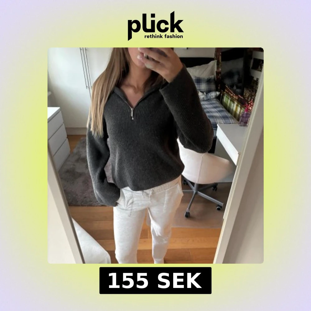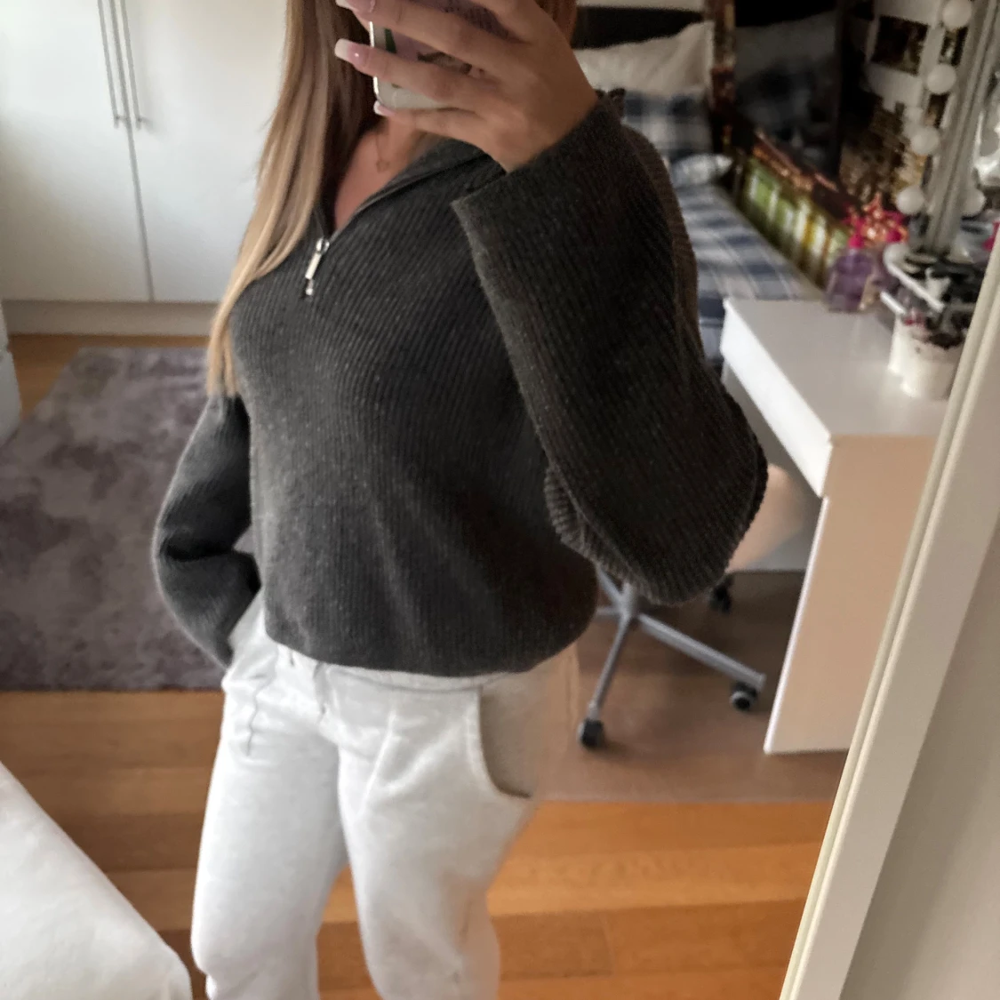 Mysig mörkgrå stickad tröja med half zip-dragkedja i halsen. Tröjan har en ribbad struktur och långa ärmar, perfekt för lager-på-lager och chill dagar. Snygg och enkel att matcha med både jeans och mjukisbyxor.