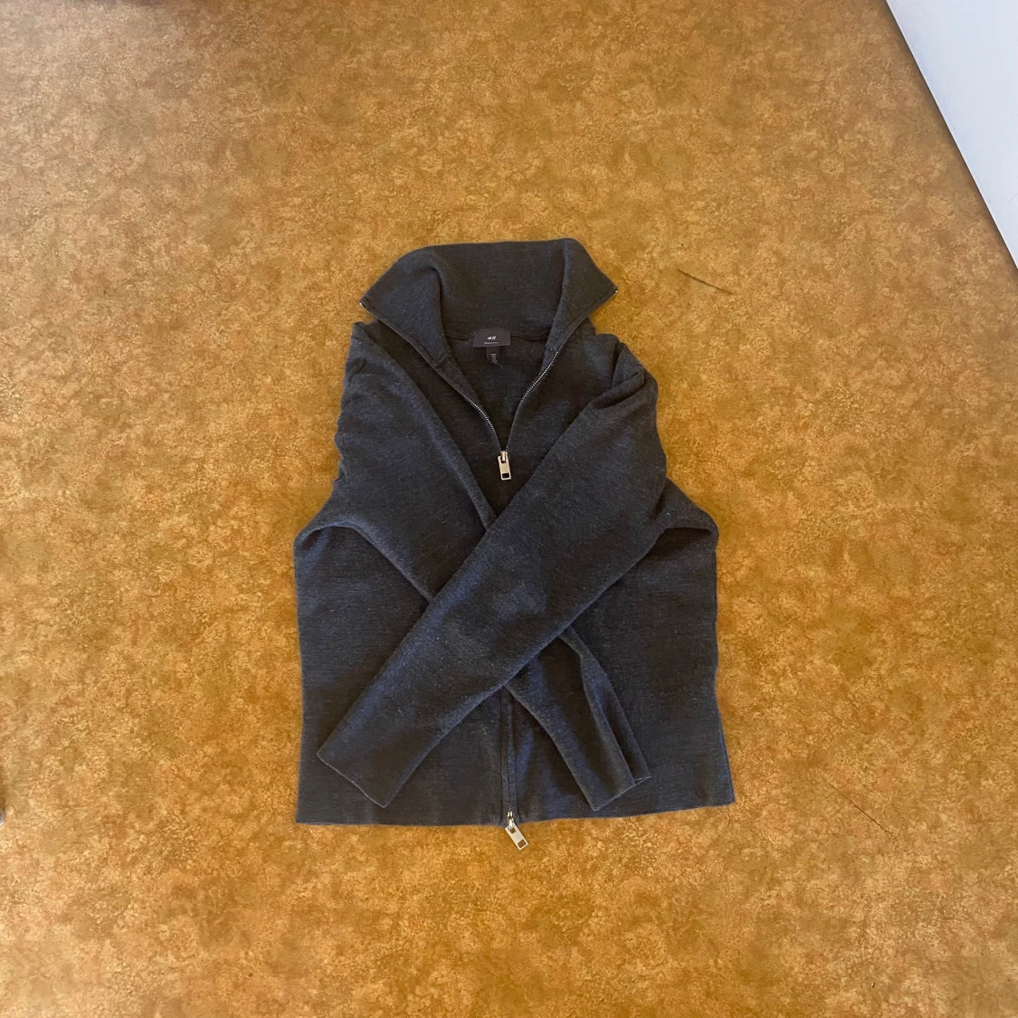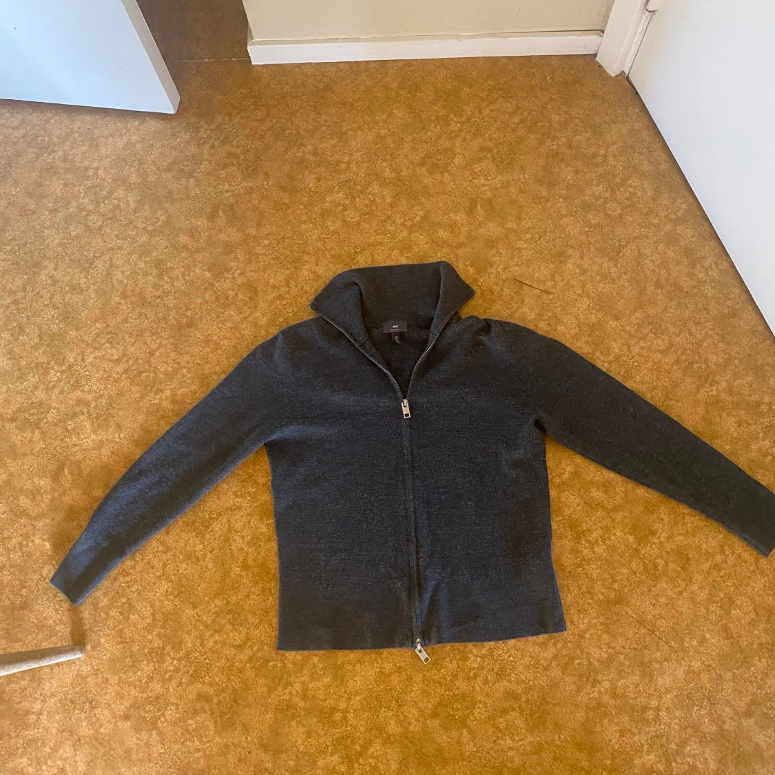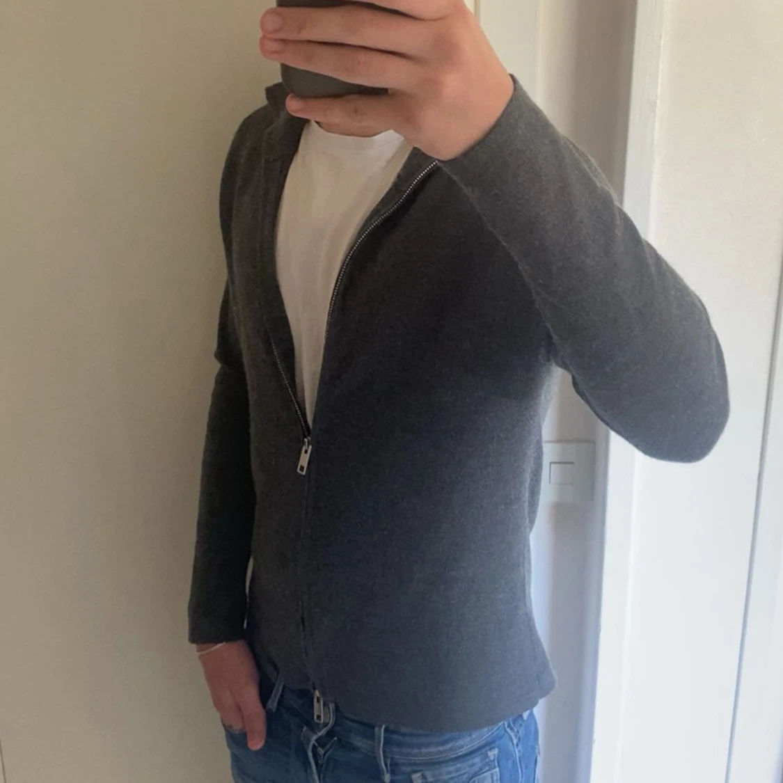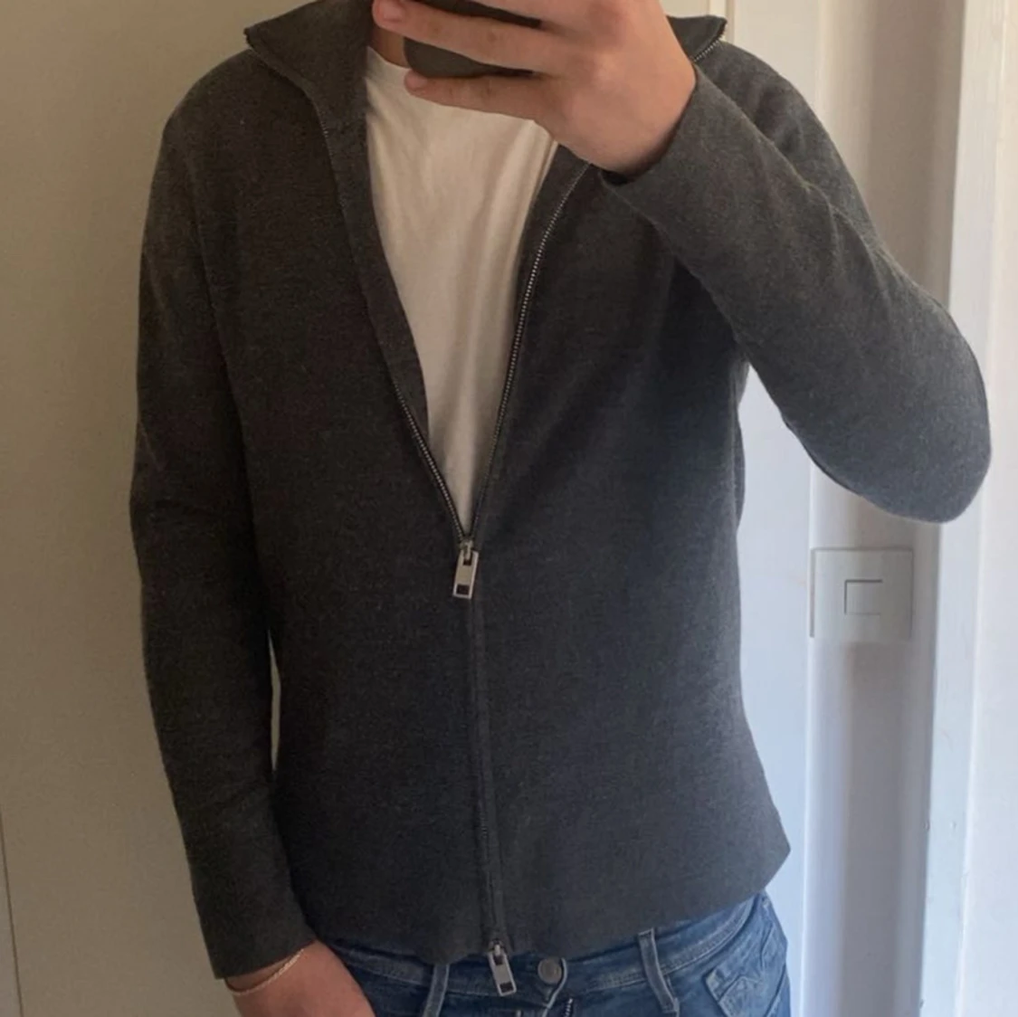 Säljer en mörkgrå stickad kofta med hel dragkedja och hög krage. Koftan är långärmad och har en clean, enkel look som passar perfekt till jeans. Materialet är mjukt och stretchigt för en skön passform.