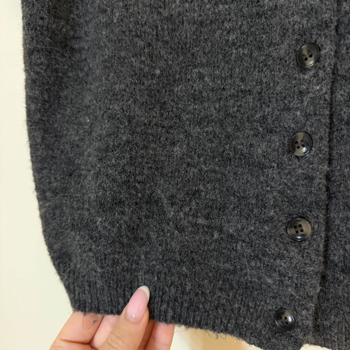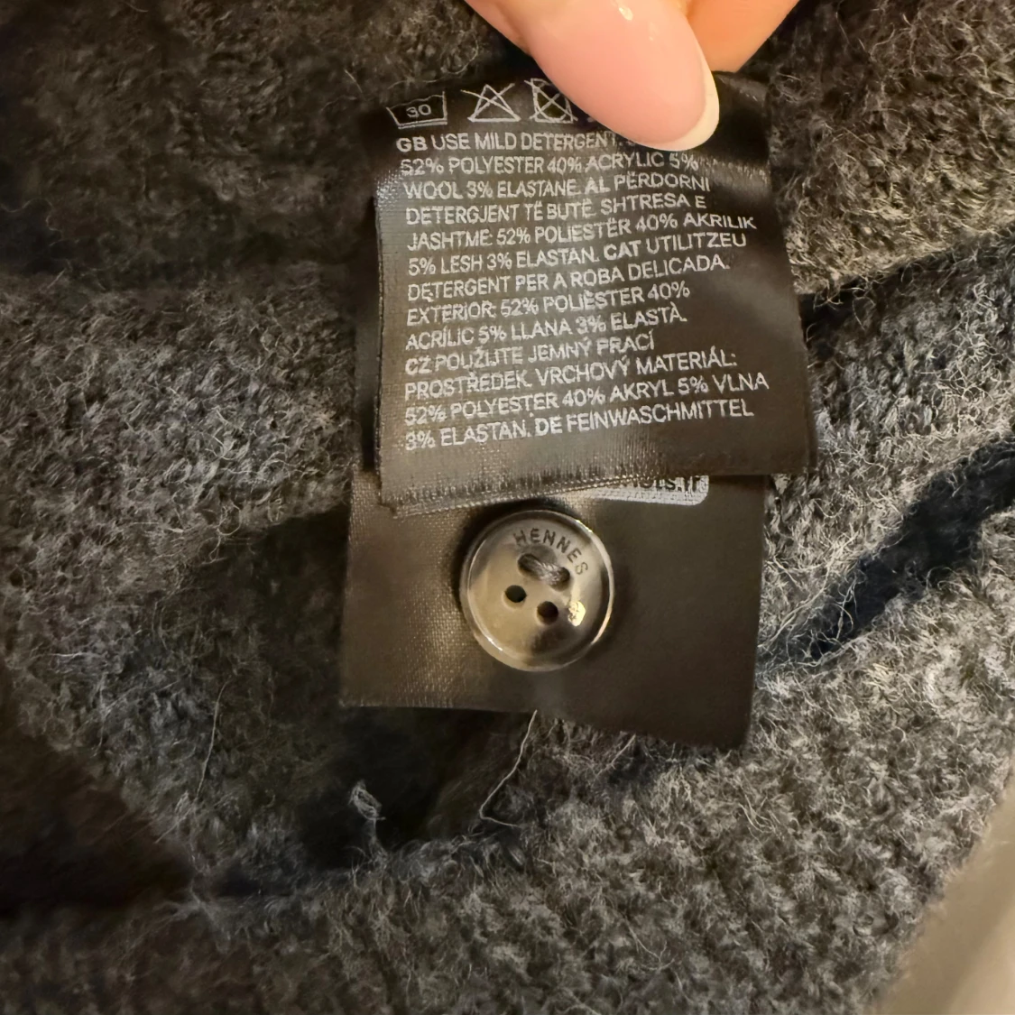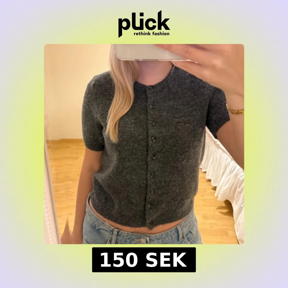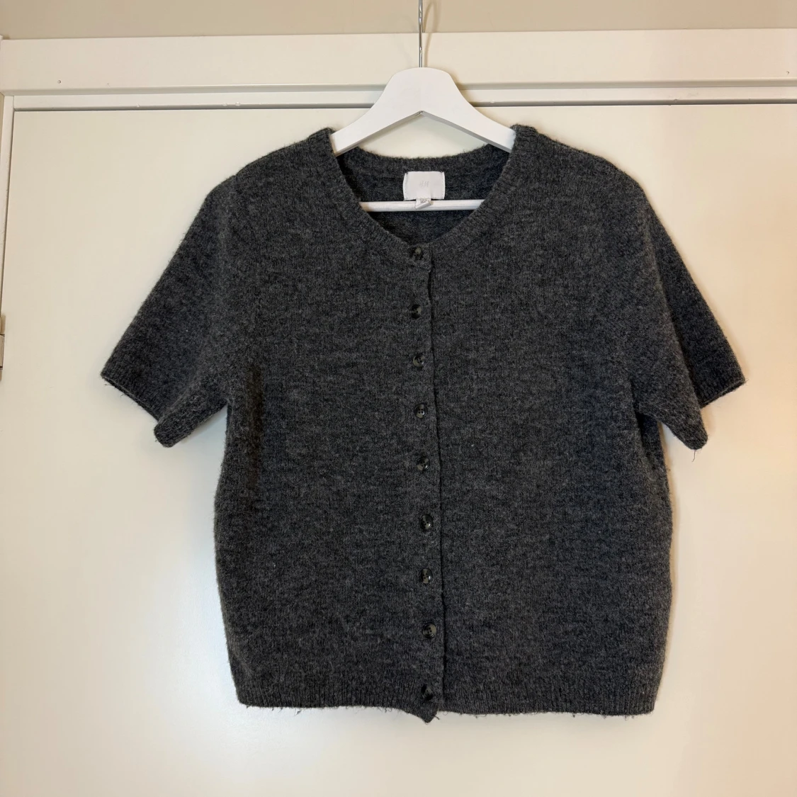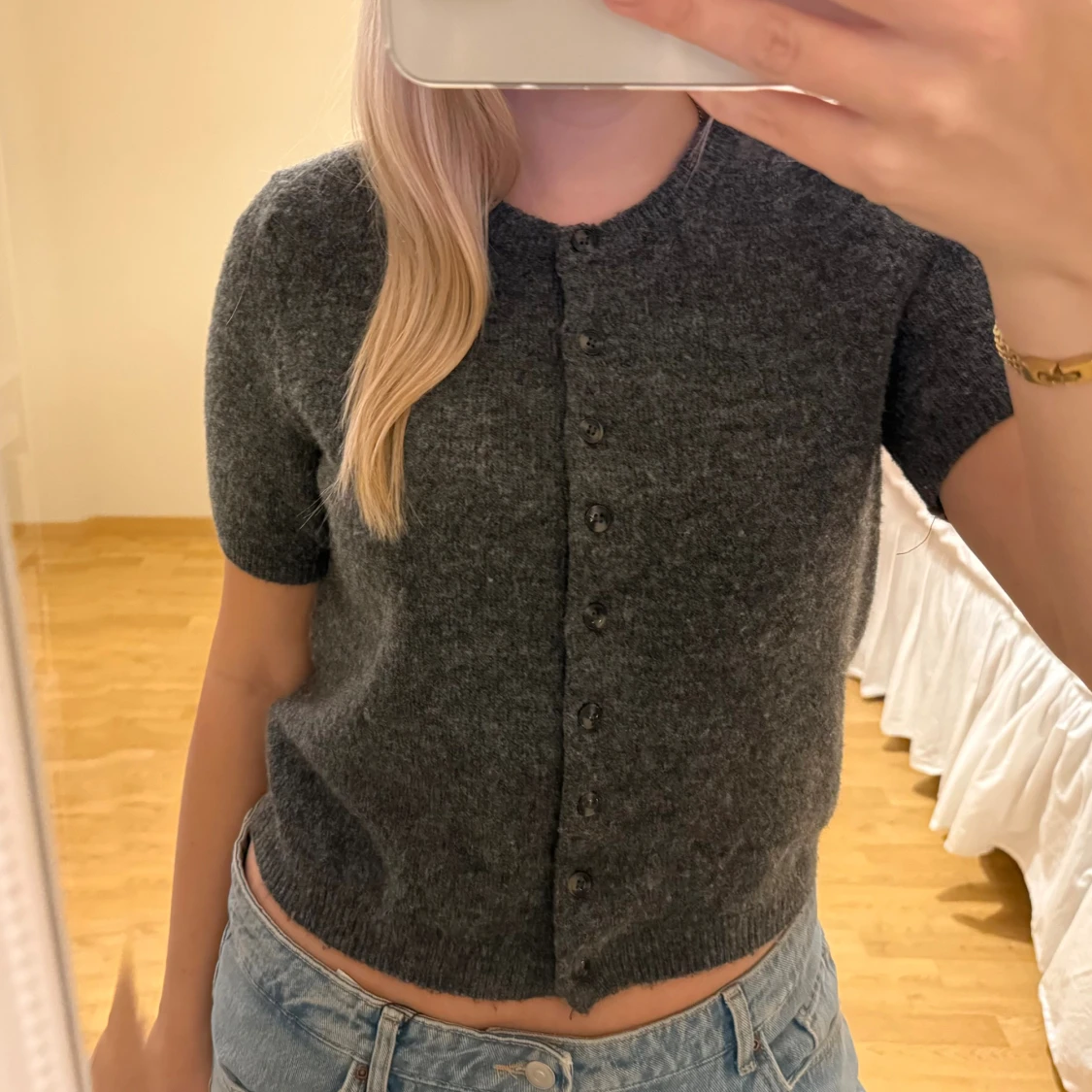 Mysig mörkgrå stickad kofta från H&M med korta ärmar och rund hals. Använd en gång, så är i nyskick! 💕