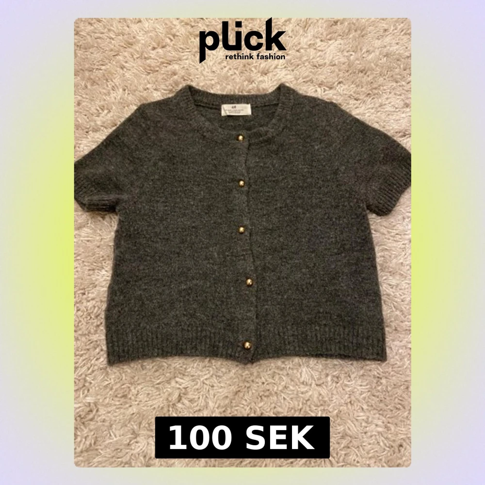 Kortärmad mörkgrå stickad kofta från H&M med snygga guldfärgade knappar framtill. Koftan har rund hals och ribbade muddar vid ärmslut och nederkant. Perfekt för lager-på-lager och chill stil.