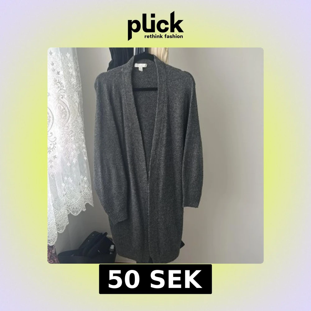 Säljer en mörkgrå, lång och mysig stickad kofta från H&M i storlek S. Koftan har en öppen front utan knappar och långa ärmar, perfekt att slänga på sig när det är lite kyligt. Enkel och stilren design som funkar till många outfits.