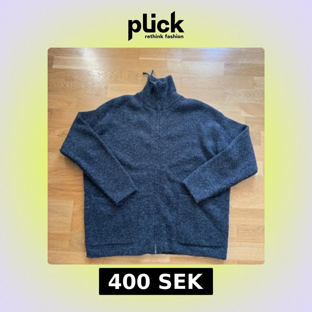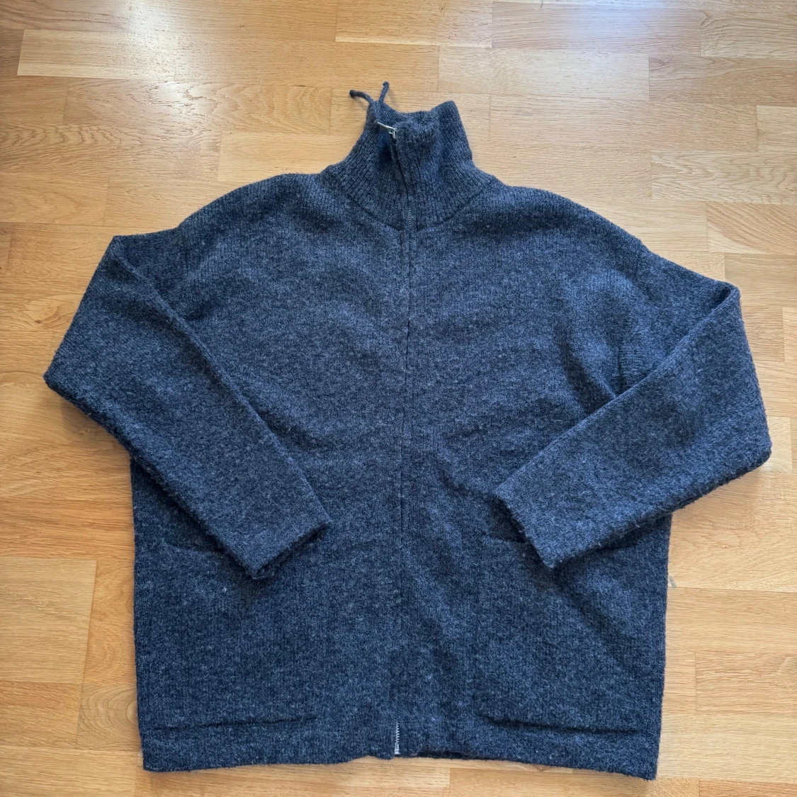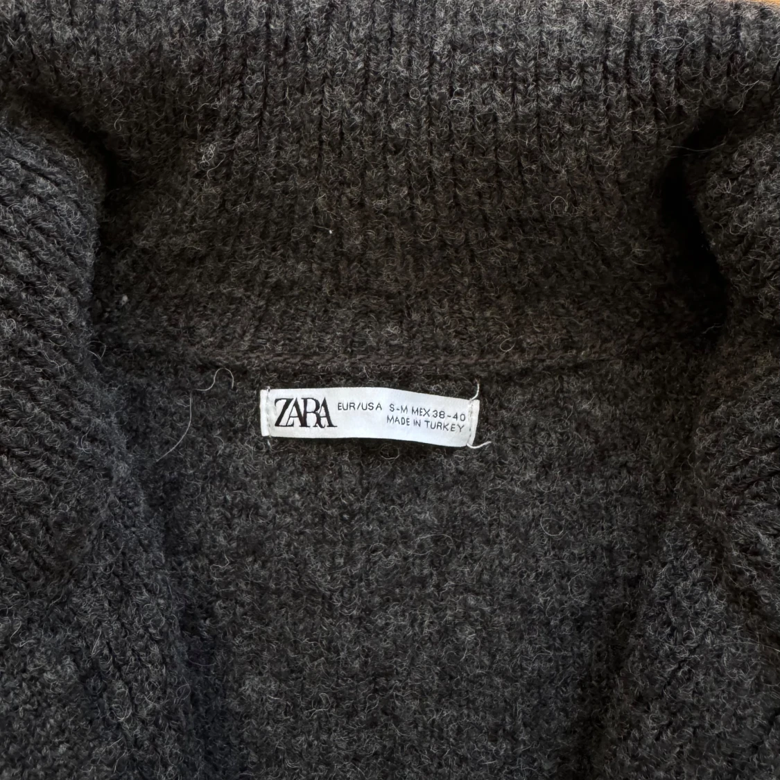 Mysig mörkgrå stickad kofta från Zara med hög krage och lång ärm. Perfekt för kyliga dagar och enkel att matcha med olika outfits. Koftan har en rak, avslappnad passform och är tillverkad i ett mjukt ullblandat material.