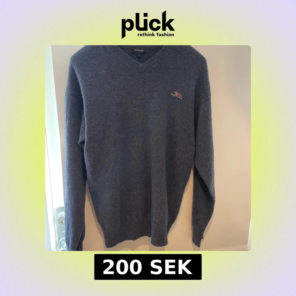Säljer en mörkgrå stickad tröja från GANT med v-ringad hals och broderad GANT USA-flagga på bröstet. Tröjan har lång ärm och klassisk passform, perfekt för lager-på-lager under kyliga dagar.