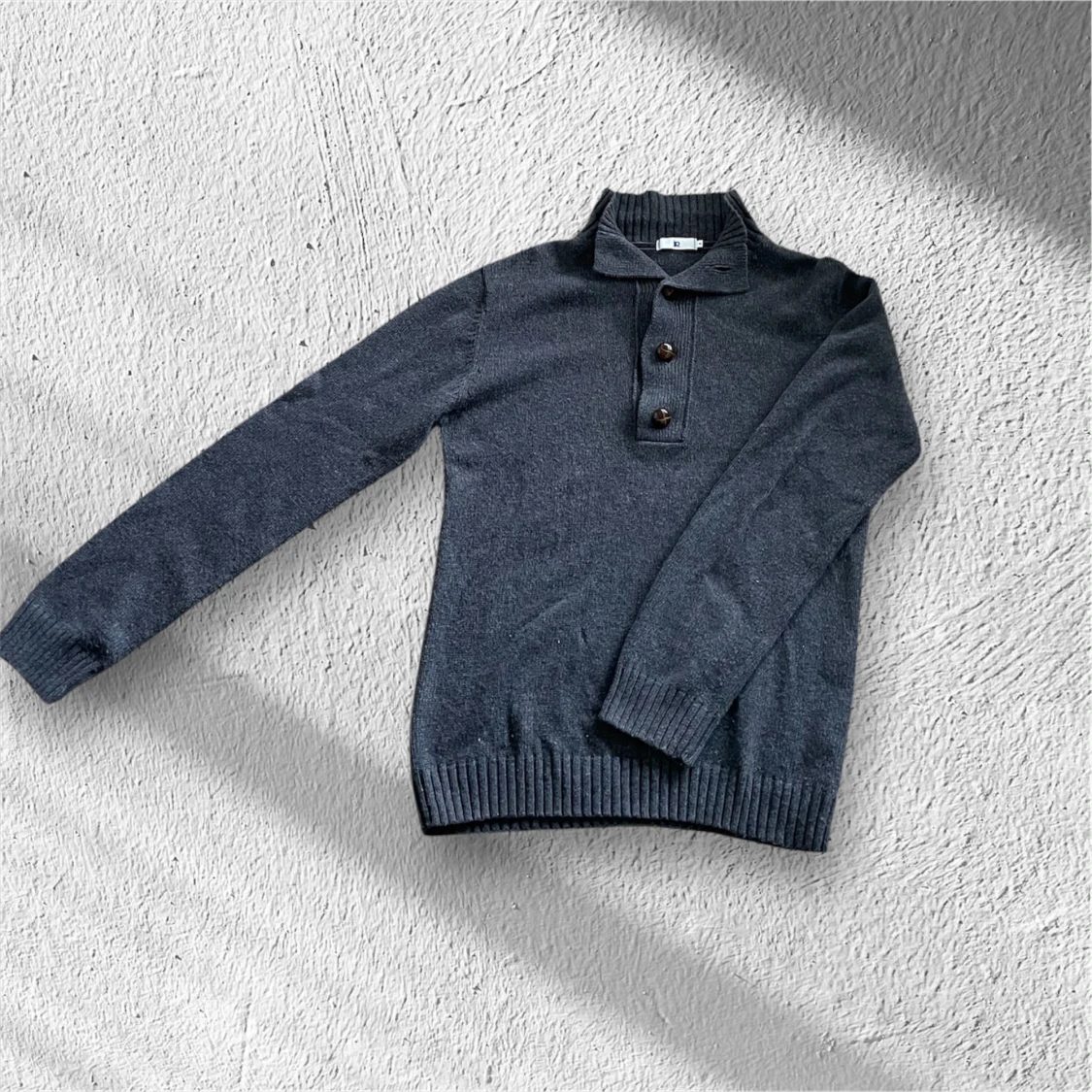 Mörkgrå stickad tröja från JP med krage och två knappar framtill. Tröjan har lång ärm och ribbade muddar vid ärmslut och nederkant. Perfekt för lager-på-lager och chill höst- eller vinterstil.