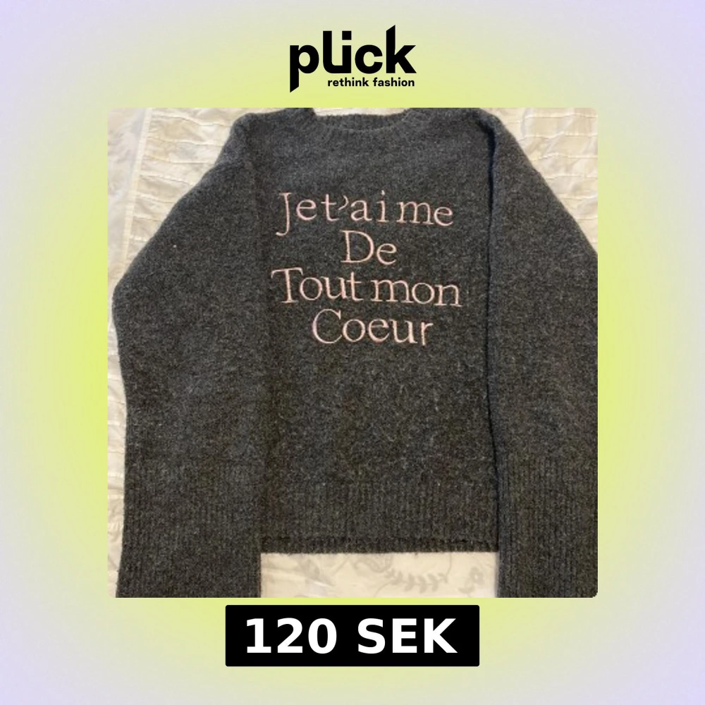 Mysig mörkgrå stickad tröja med rosa broderad text 'Je t'aime de tout mon coeur' på framsidan. Tröjan har långärmade ribbstickade muddar och en klassisk rund hals. Perfekt för dig som gillar franska vibes och vill ha något extra mjukt och varmt.