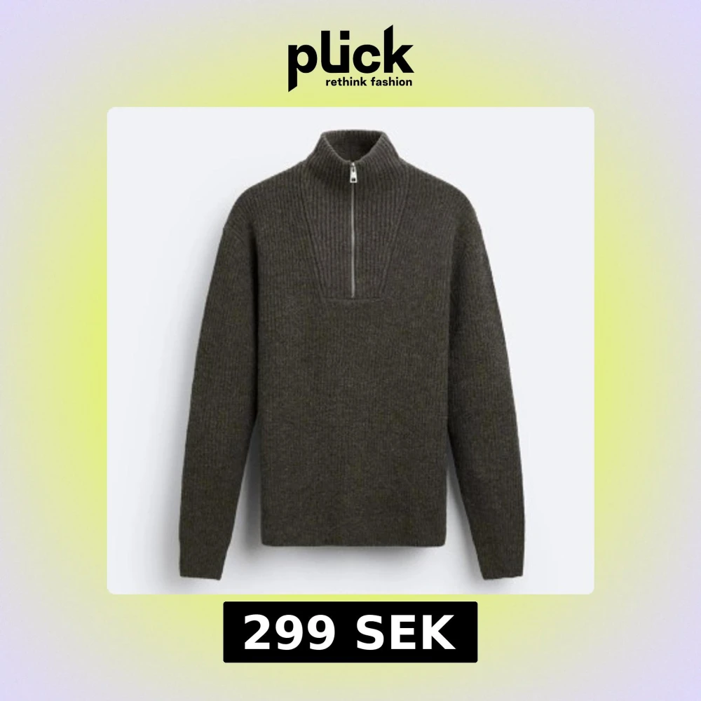 Säljer en stilren mörkgrå stickad tröja med dragkedja i halsen. Perfekt för kyliga dagar med sin höga krage och långa ärmar. Tröjan har en ribbad struktur upptill som ger en snygg detalj. Passar både till vardags och mer avslappnade tillfällen.