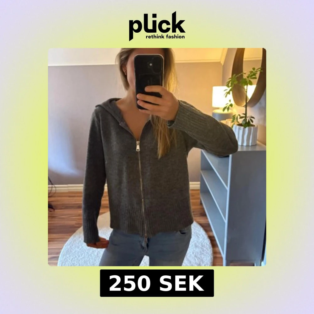 Mysig mörkgrå stickad tröja med huva och hel dragkedja framtill. Den är tunn i materialet men skön att bära. Finns ingen lapp men är ganska säker att den är från Lindex. Storlek L men skulle säga att den är mer S