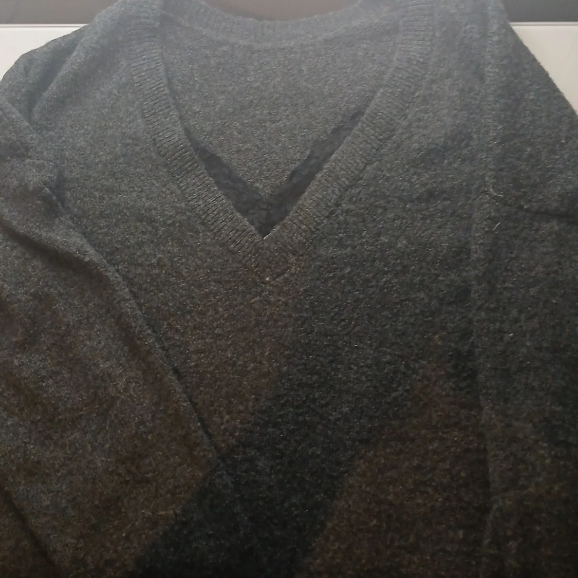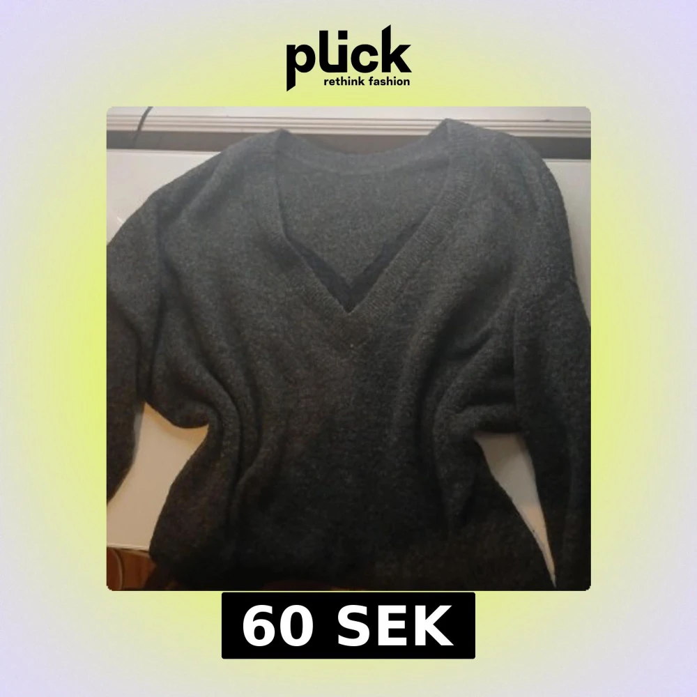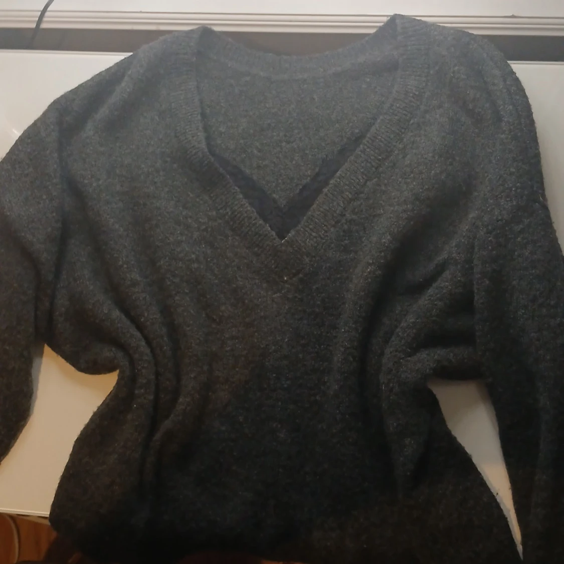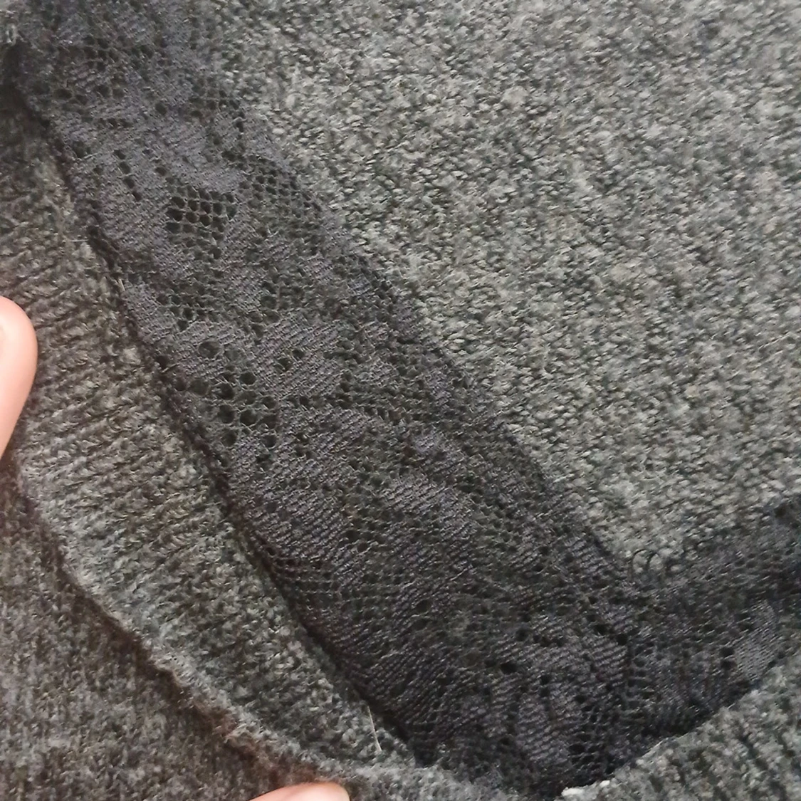 Mysig mörkgrå stickad tröja med v-ringning och svart spetsdetalj längs halsringningen. Tröjan har långa ärmar och en klassisk, avslappnad passform. Perfekt för lager-på-lager och chill höst- eller vinterstil.