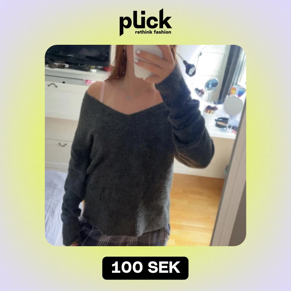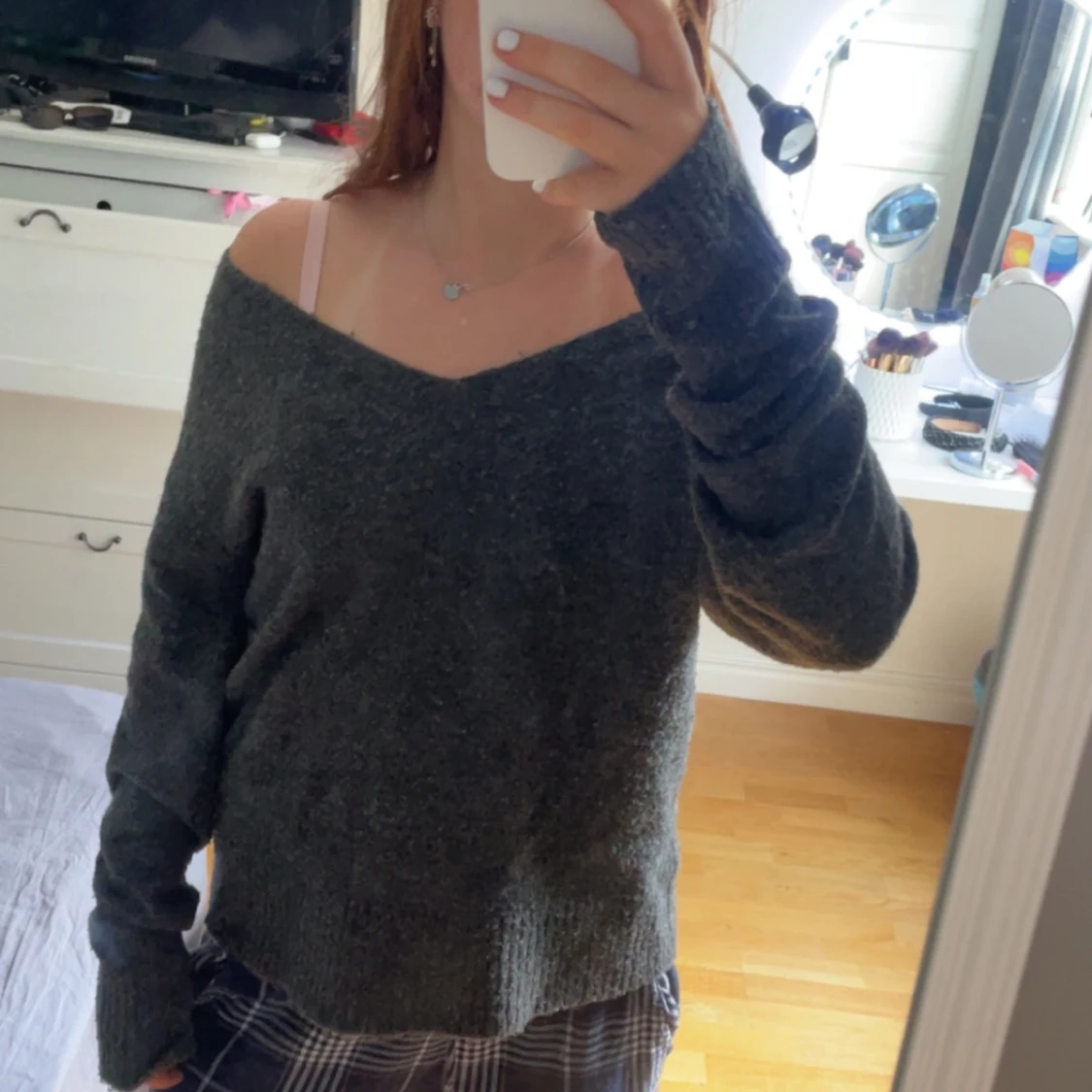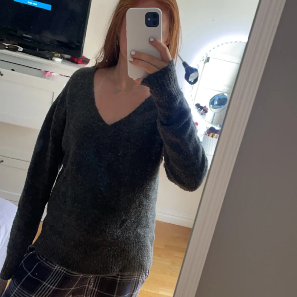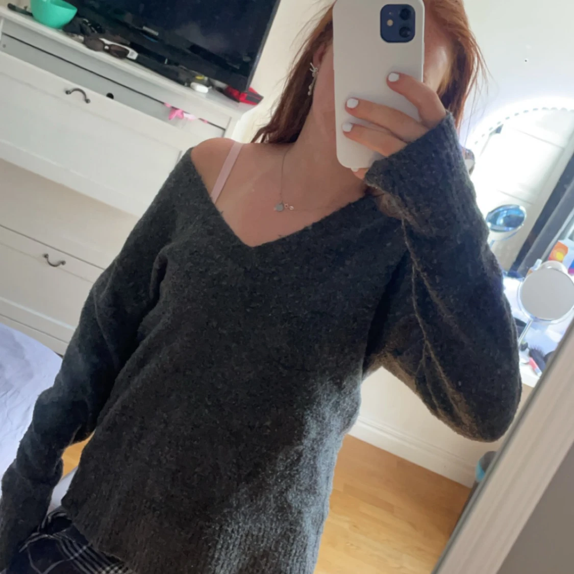 En bekväm mörkgrå stickad tröja med v-ringning. Tröjan har långa ärmar och en lös passform.