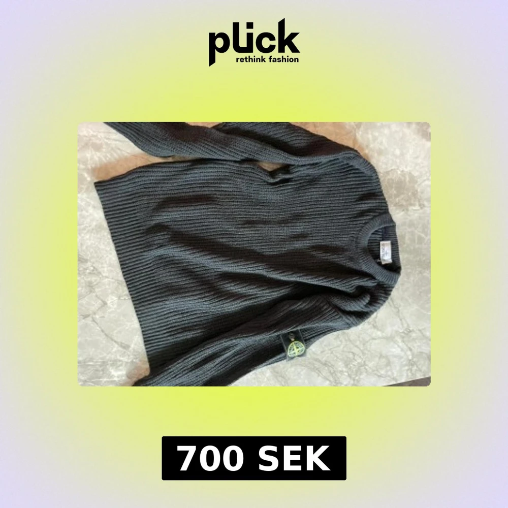 Säljer en mörkgrå stickad tröja från Stone Island med klassisk rund hals och ribbad struktur. Tröjan har lång ärm och den ikoniska Stone Island-loggan på vänster ärm. Perfekt för dig som gillar stilrena och coola plagg.