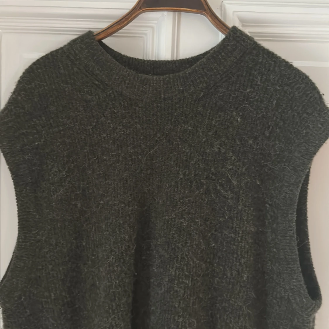 Mörkgrå stickad väst från Samsøe Samsøe med rund halsringning och breda ärmhål.