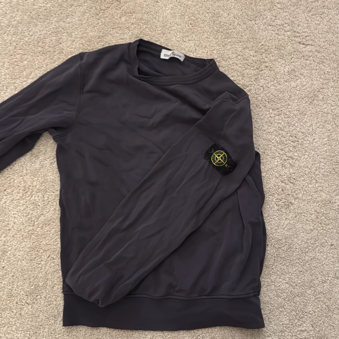 Säljer en mörkgrå sweatshirt från Stone Island med den klassiska patchen på vänster ärm. Tröjan har rund hals, långa ärmar och ribbade muddar. Perfekt för dig som gillar streetwear och vill ha något stilrent med ikonisk logga.