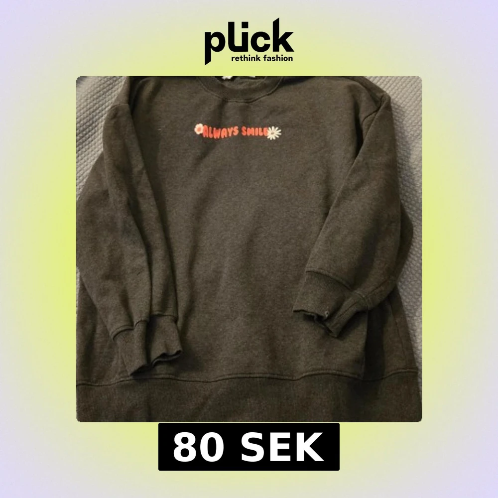 Mysig mörkgrå sweatshirt från Primark med rosa text och blommor på bröstet och ryggen. Texten säger 'Always Smile' och 'Nothing to do today but smile'. Tröjan har långa ärmar och ribbade muddar. Bra till jeans! Eller till mysig tröja hemma! Stl xs men är oversized! Skriv om du är intresserad eller har några frågor! 🫶🌸🍁