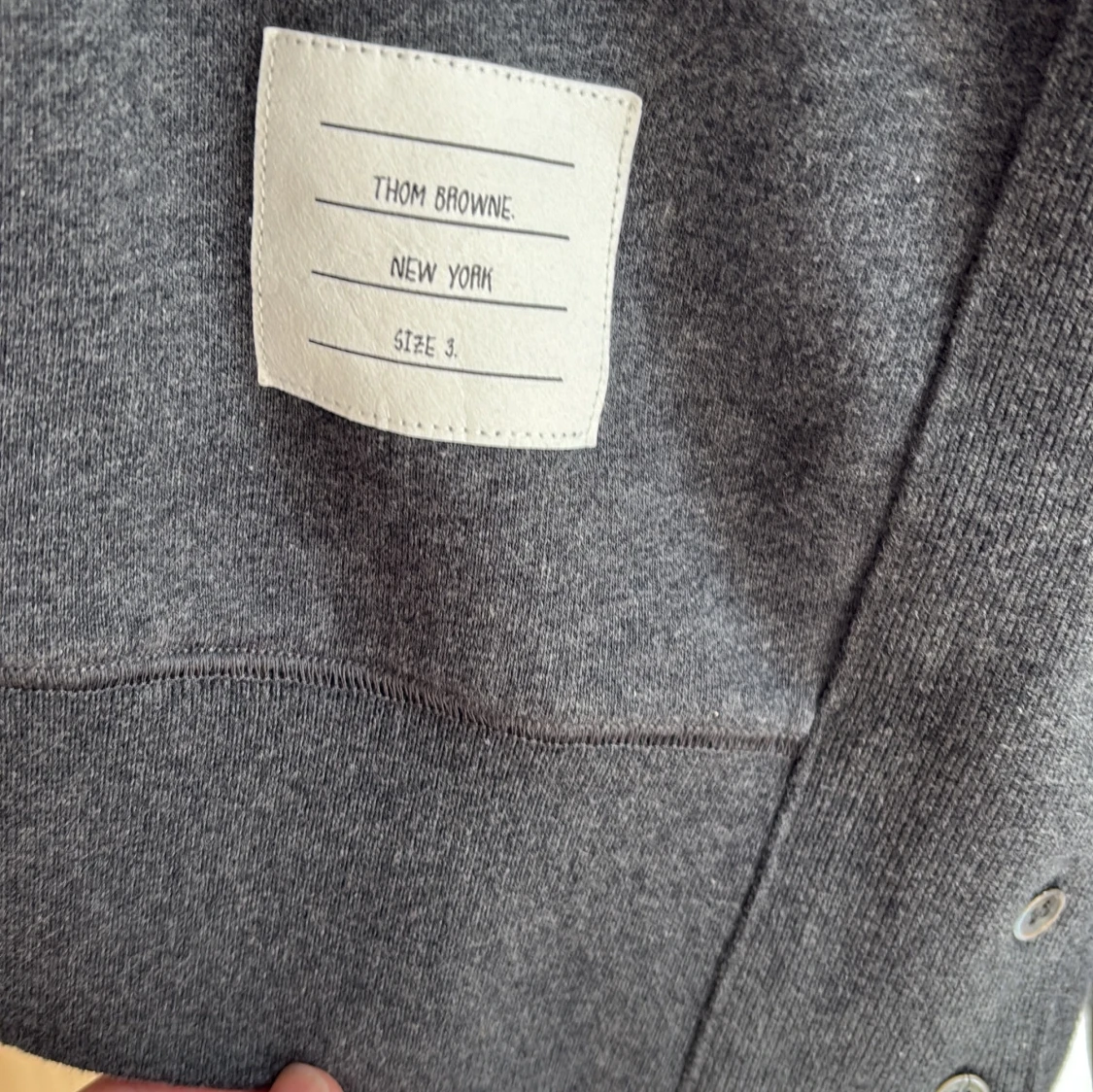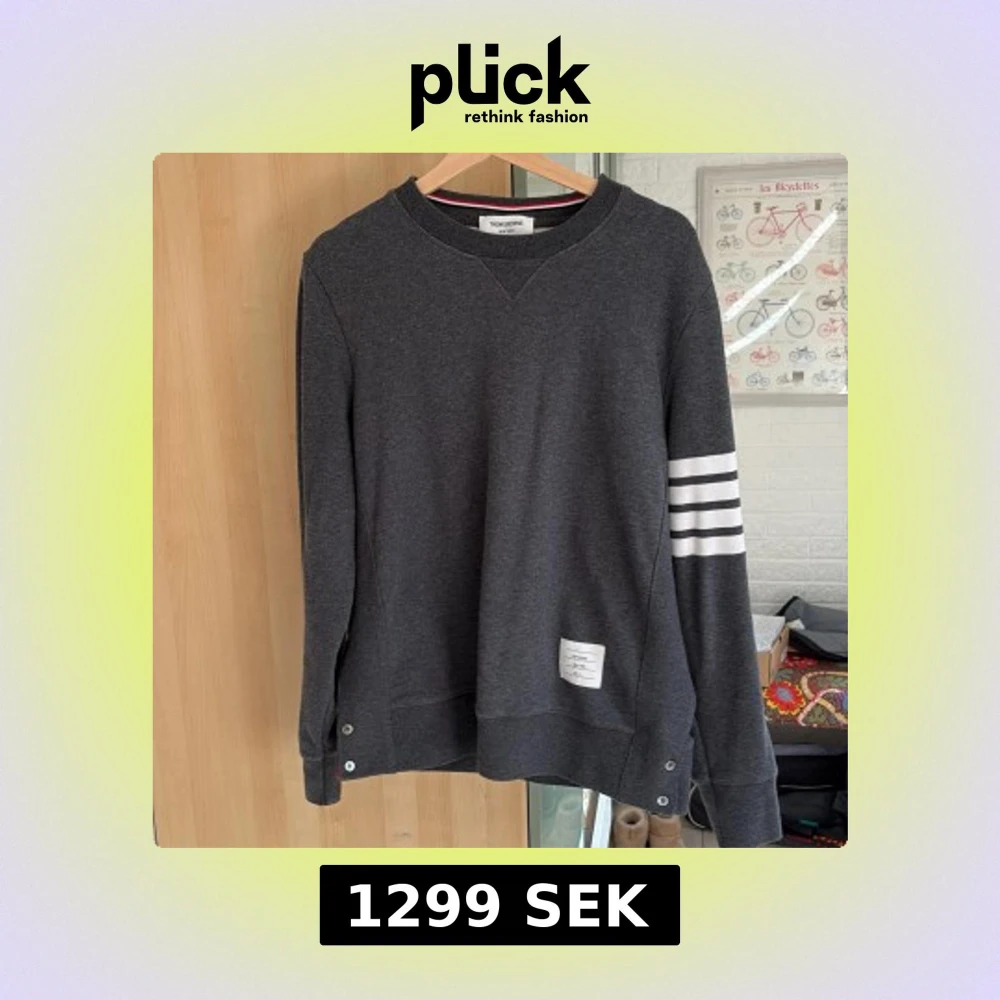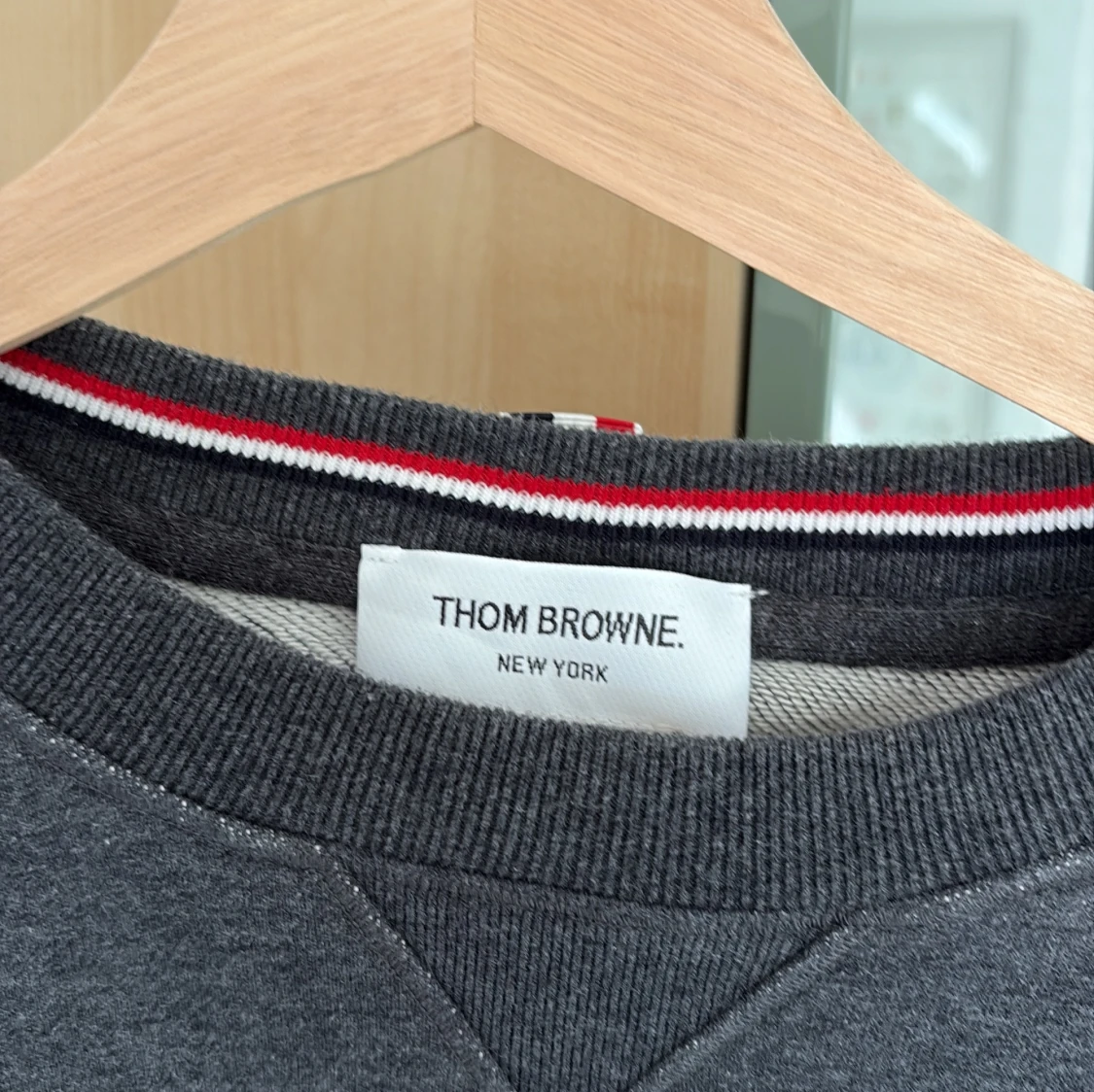Säljer en mörkgrå sweatshirt från Thom Browne med klassiska vita ränder på ena ärmen och märkets etikett framtill. Tröjan har rund halsringning och ribbade muddar. Perfekt för en stilren och sportig look.