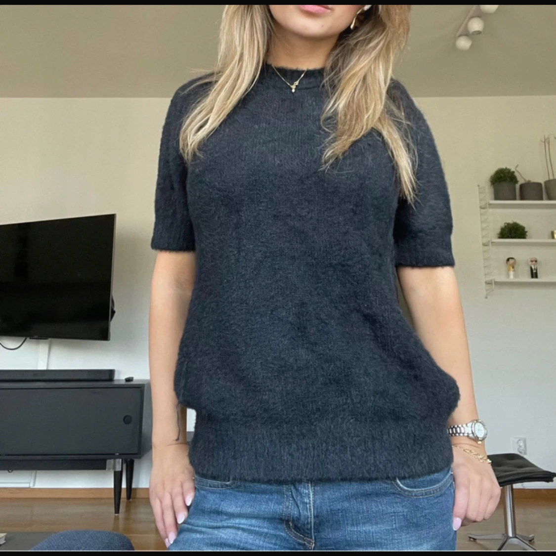 Säljer en stilren mörkgrå tröja med korta ärmar från shein. Perfekt för en avslappnad look. Tröjan har en mjuk och bekväm känsla, idealisk för både vardag och mysiga stunder hemma.